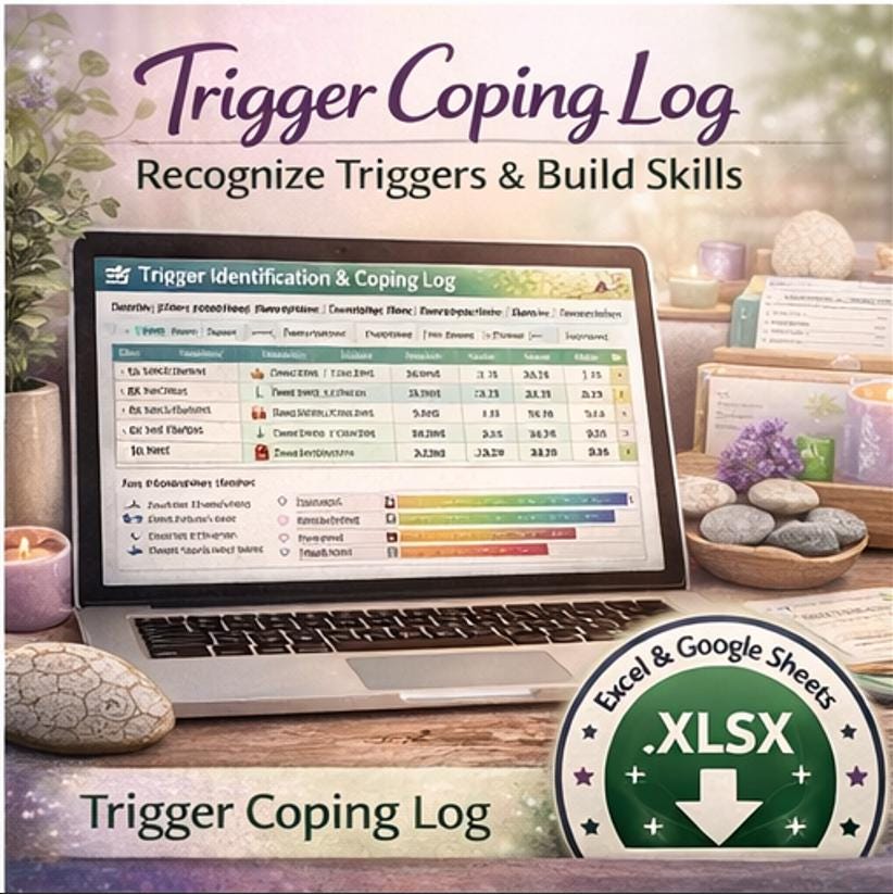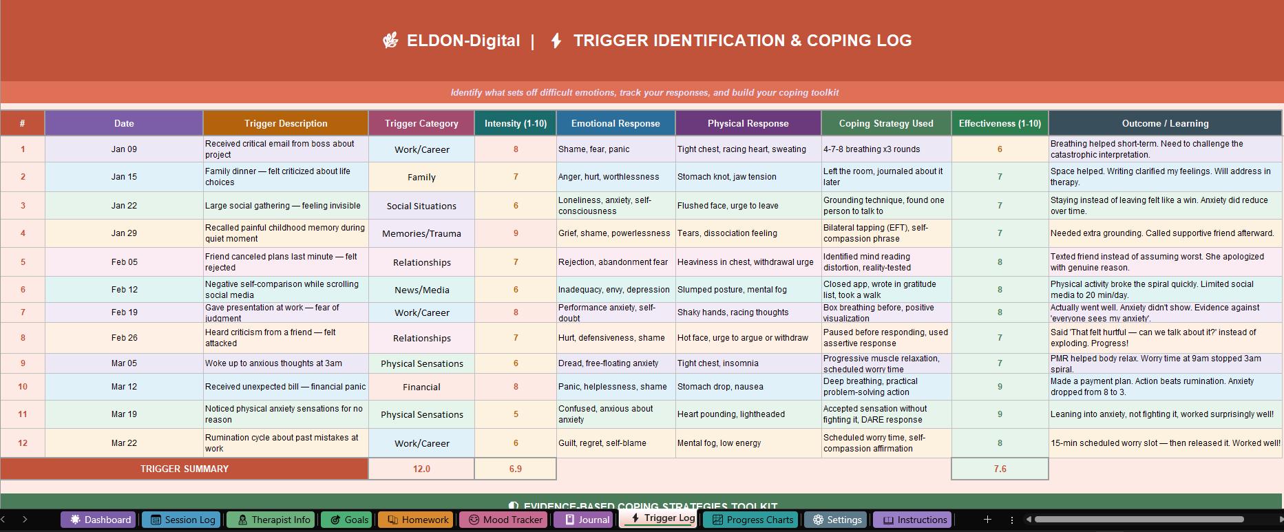 β‘ 8. Trigger Identification & Coping Log -One of the most powerful sheets in the tracker. Log what triggered you, the category (Work, Relationships, Family, Trauma, Social, Financial, and more), intensity (1-10), emotional response, physical response, which coping strategy you used, how effective it was (1-10), and what you learned. Plus an 8-skill evidence-based Coping Strategies Toolkit at the bottom including 4-7-8 Breathing, 5-4-3-2-1 Grounding, PMR, Thought Records, DARE Response, Behavioral Activation, Self-Compassion Break, and Scheduled Worry Time π‘οΈ