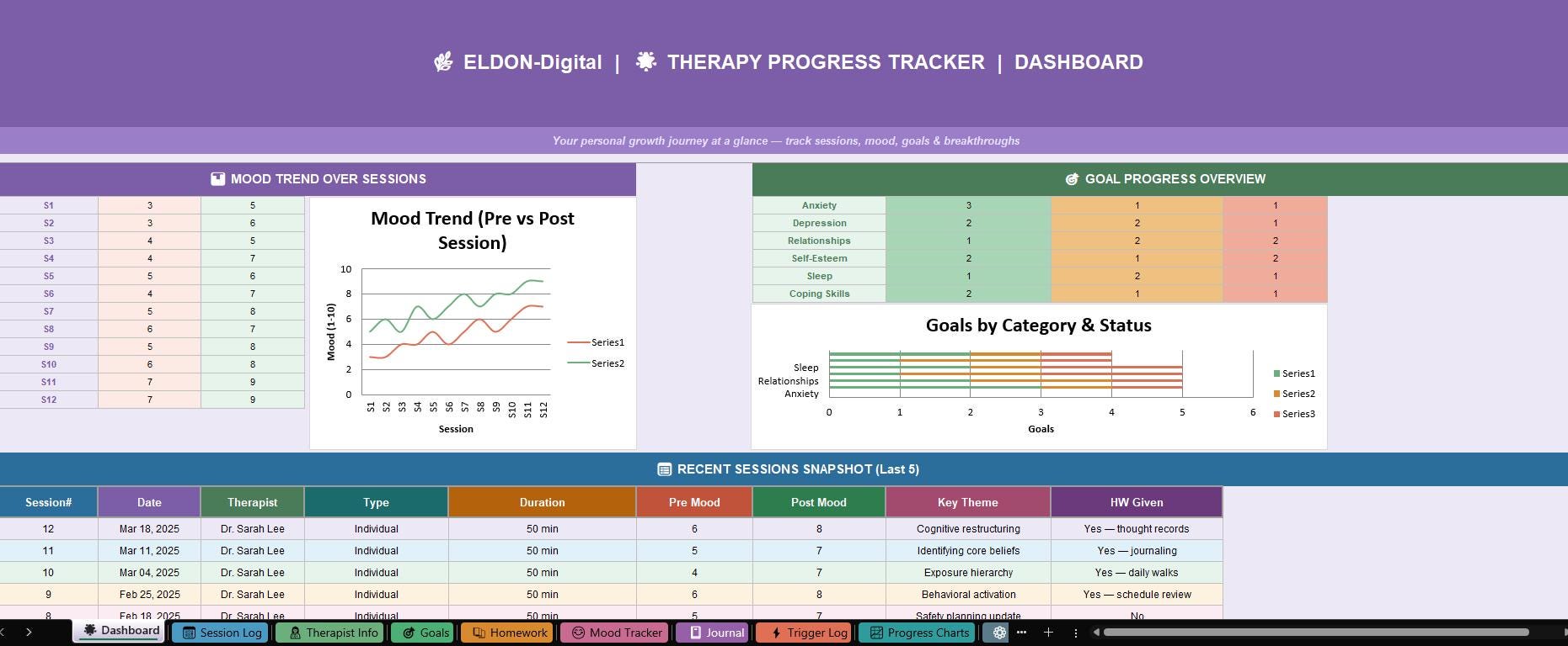 π 1. Progress Dashboard -Your personal healing command center! 12 live KPI cards automatically display Total Sessions, Active Goals, Goals Completed, Homework Done, Average Post-Session Mood, Triggers Logged, Journal Entries, Mood Improvement Score, Homework Completion Rate, Weeks in Therapy, and more. Features a real-time Mood Trend line chart (Pre vs. Post session over 12 sessions), a Goal Progress stacked bar chart by category, a Recent Sessions Snapshot table, and 5 motivational milestone notes that remind you how far you have come π