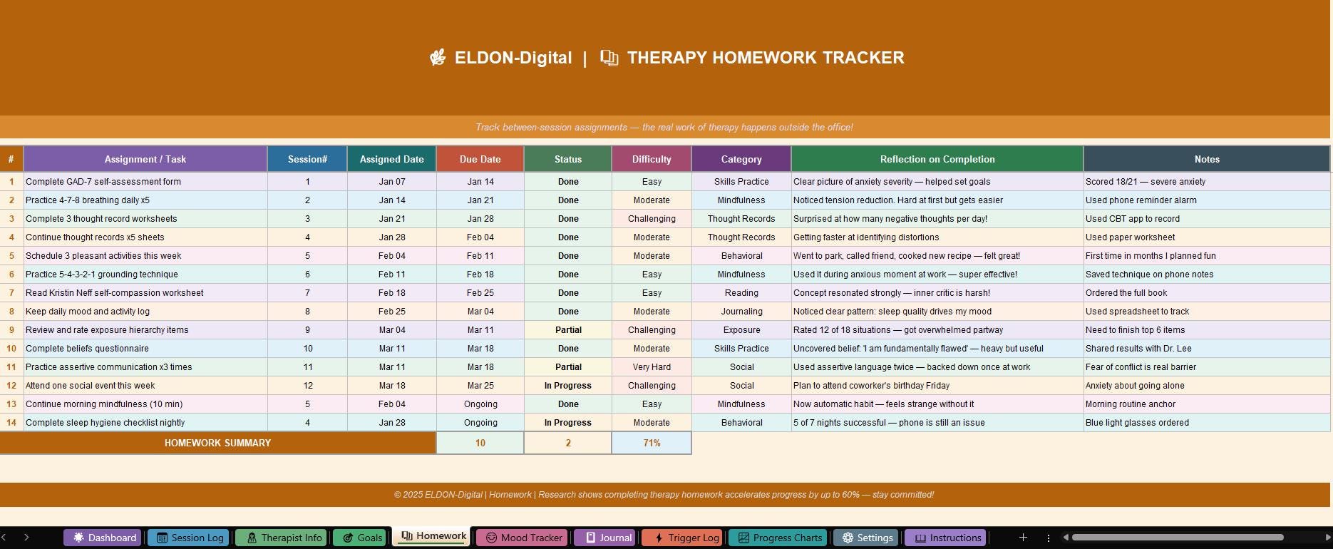 π 5. Homework Tracker -Research shows that completing therapy homework accelerates progress by up to 60%. Track every assignment with: description, session number, assigned date, due date, status (Not Started / In Progress / Done / Partial / Skipped), difficulty level, category (Thought Records, Mindfulness, Behavioral, Journaling, Exposure, Social), and your personal reflection on completion. Summary row auto-calculates your completion rate percentage π