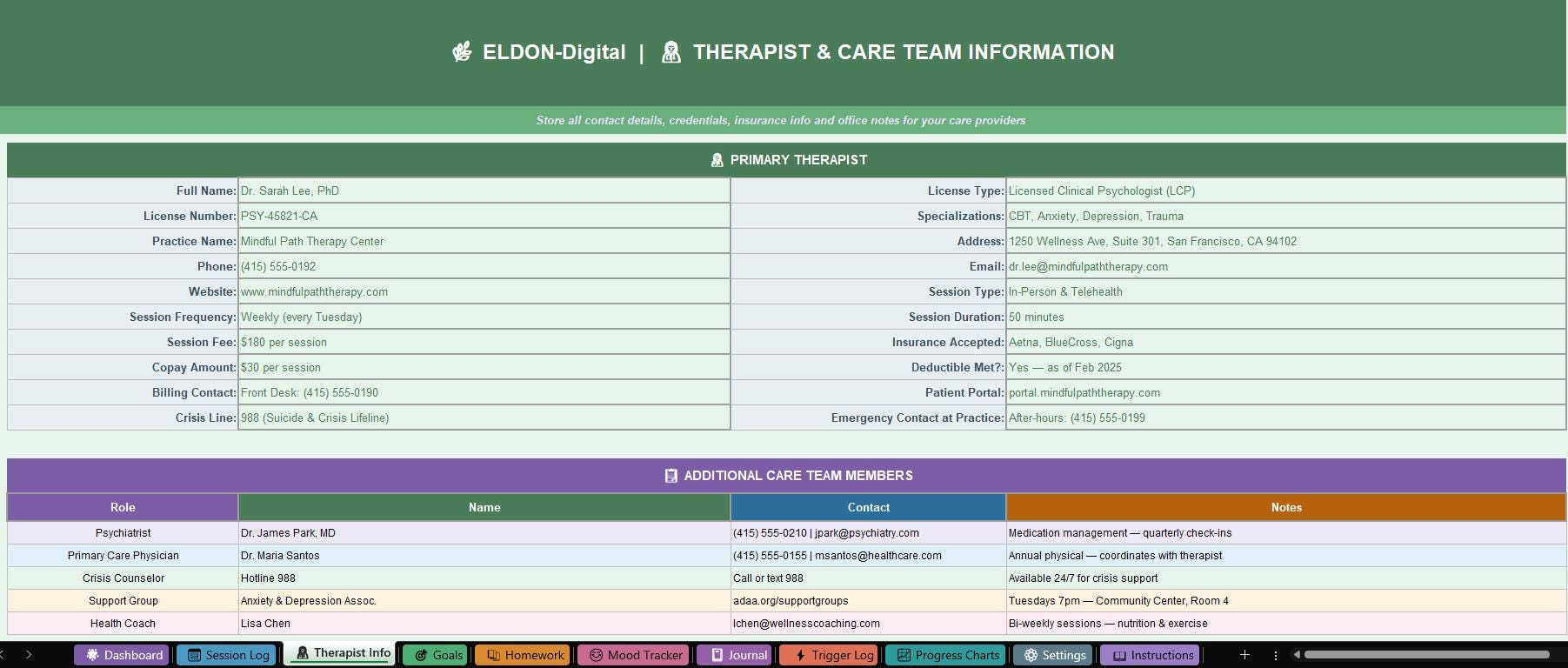 π©ββοΈ 3. Therapist & Care Team Info -Store every important contact in one secure place. Full therapist profile including name, license type, specializations, practice address, phone, email, patient portal, and crisis line. A Care Team table for psychiatrist, primary care physician, support groups, and health coaches. Complete insurance and billing section with deductible tracking, copay, sessions authorized vs. used, and pre-auth requirements π₯