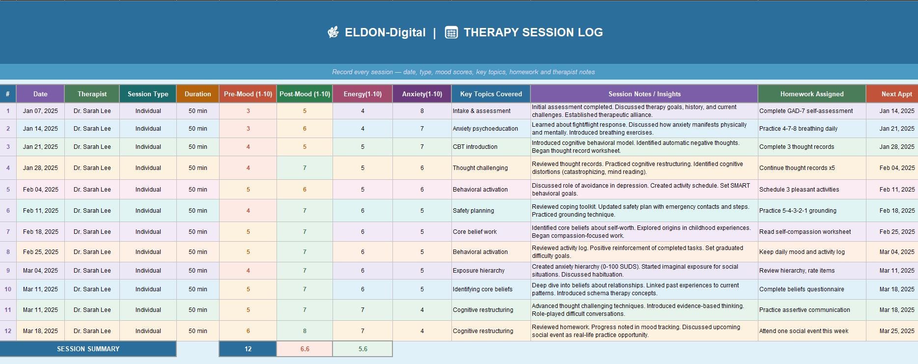 2. Session Log -Log every therapy session with rich detail: session number, date, therapist name, session type, pre-session mood (1-10), post-session mood (1-10), energy level, anxiety rating, key topics covered, session notes and insights, homework assigned, and next appointment. Mood cells automatically color-code π΄ Low β π‘ Neutral β π’ High so you can see patterns at a glance. Summary row auto-calculates average pre and post mood scores across all sessions β€οΈβπ©Ή