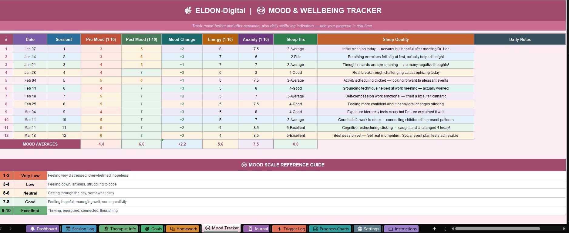 π 6. Mood & Wellbeing Tracker -The heart of your daily mental health monitoring! Record pre-session mood, post-session mood, an automatic mood change formula (+/-), energy level, anxiety rating, hours of sleep, and sleep quality for every session. Averages row calculates all metrics automatically. A full Mood Scale Reference Guide explains what each score means (1-2 = Very Low through 9-10 = Thriving). Color-coded cells make patterns instantly visible π