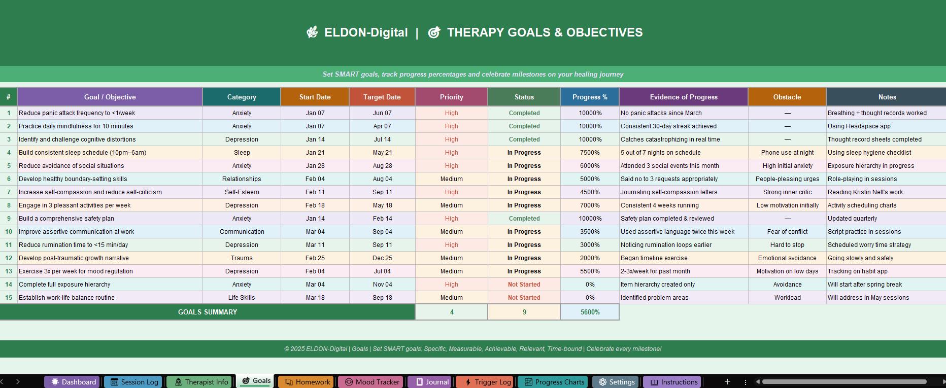 π― 4. Goals & Objectives -Set powerful SMART therapy goals and watch them come alive. Record goal name, category (Anxiety, Depression, Relationships, Sleep, Coping Skills, and more), start and target dates, priority level, status (Not Started β In Progress β Completed), progress percentage, evidence of progress, obstacles, and notes. A summary row tracks total completed, in-progress goals, and your average goal progress across all objectives π±