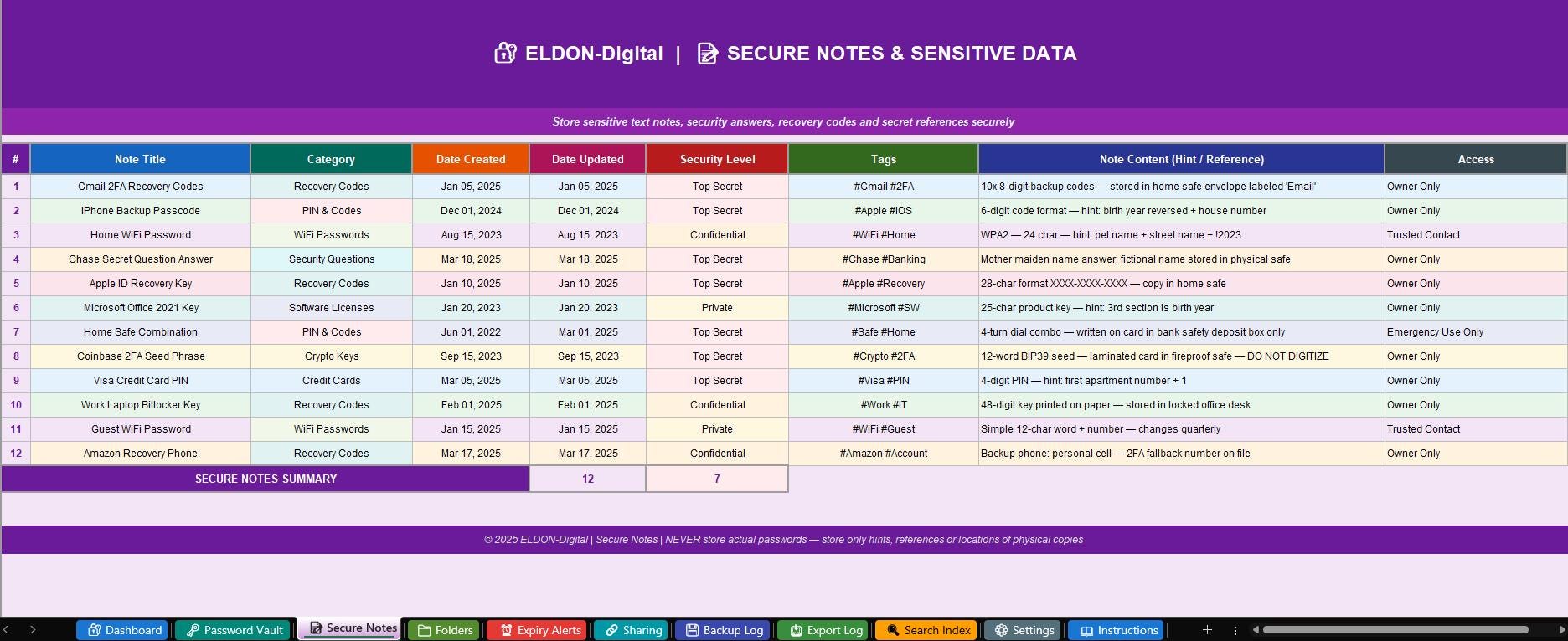 β οΈ IMPORTANT SECURITY NOTE: This manager uses a password HINT system -you never write your actual passwords in plain text. Instead you store memorable clues only YOU would understand. We also provide full instructions on encrypting the Excel file with AES-level protection so your data is always secure. β