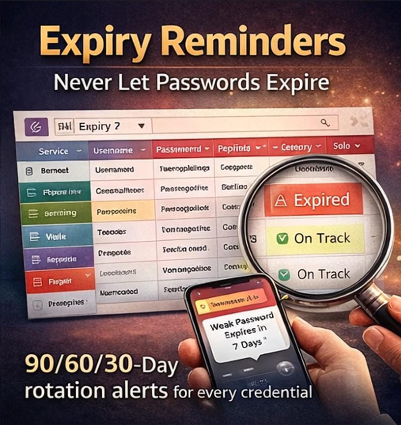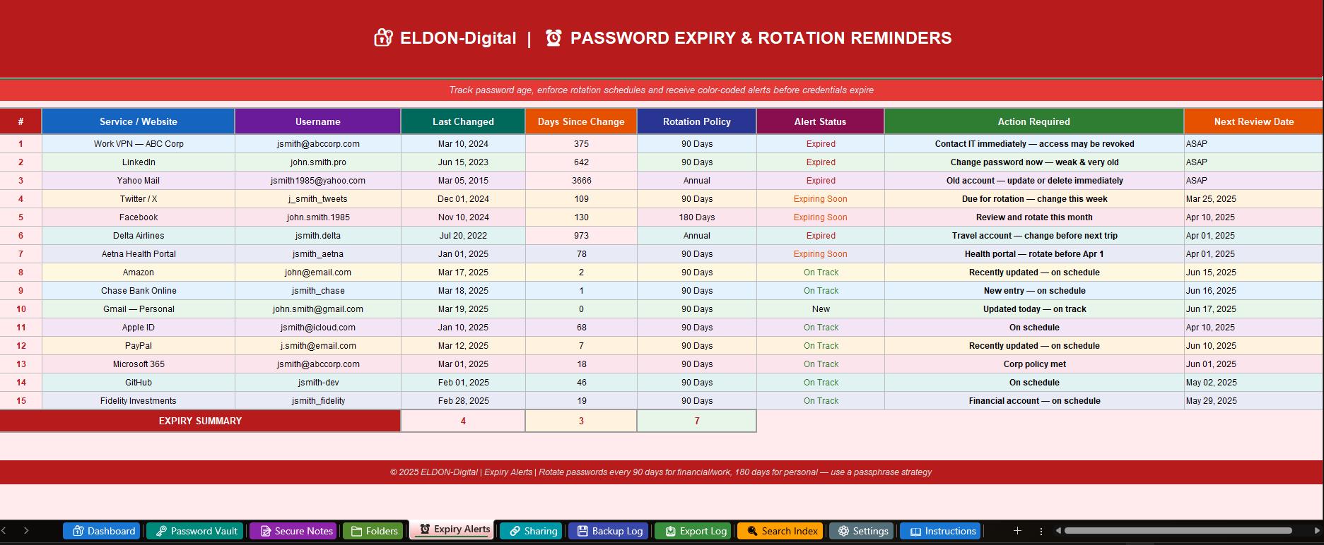 β° 5. Password Expiry & Rotation Reminders -Never let a password grow dangerously old again. Track each credential's last-changed date, days since last change, rotation policy (30/60/90/180 days/Annual), and alert status. The 3-tier color alert system fires automatically: π΄ Expired (red) for overdue rotations, π‘ Expiring Soon (orange) for approaching deadlines, π’ On Track (green) for compliant passwords. Includes required action descriptions and next review dates. Summary row auto-counts expired, expiring, and on-track credentials. Financial and work passwords flag red after 90 days π