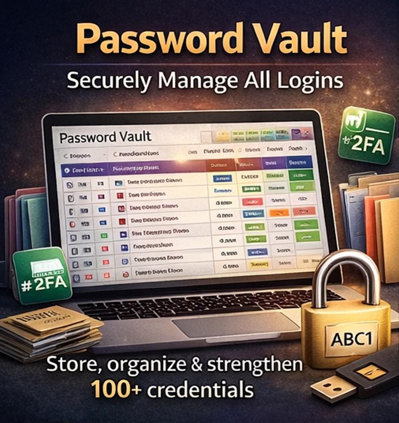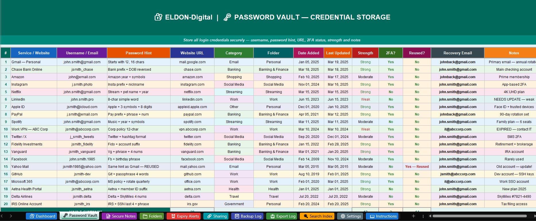 Q: How many credentials can this hold? A: The Password Vault is designed for 100+ entries out of the box. Simply add rows following the same format -all formulas automatically include new data. There is no practical limit.