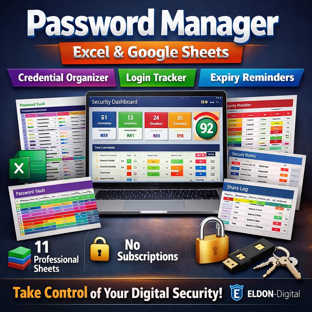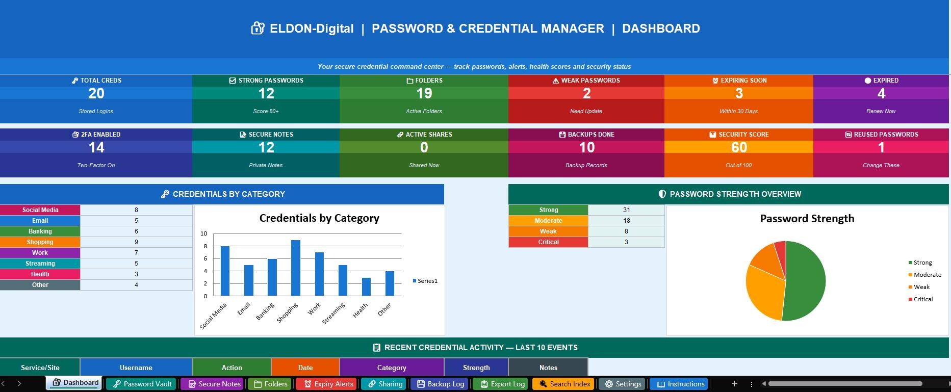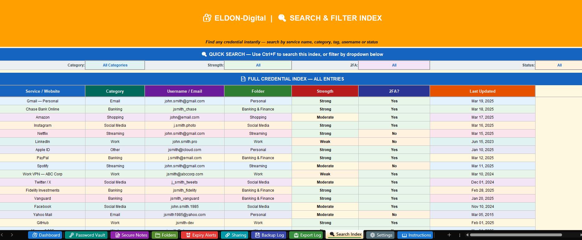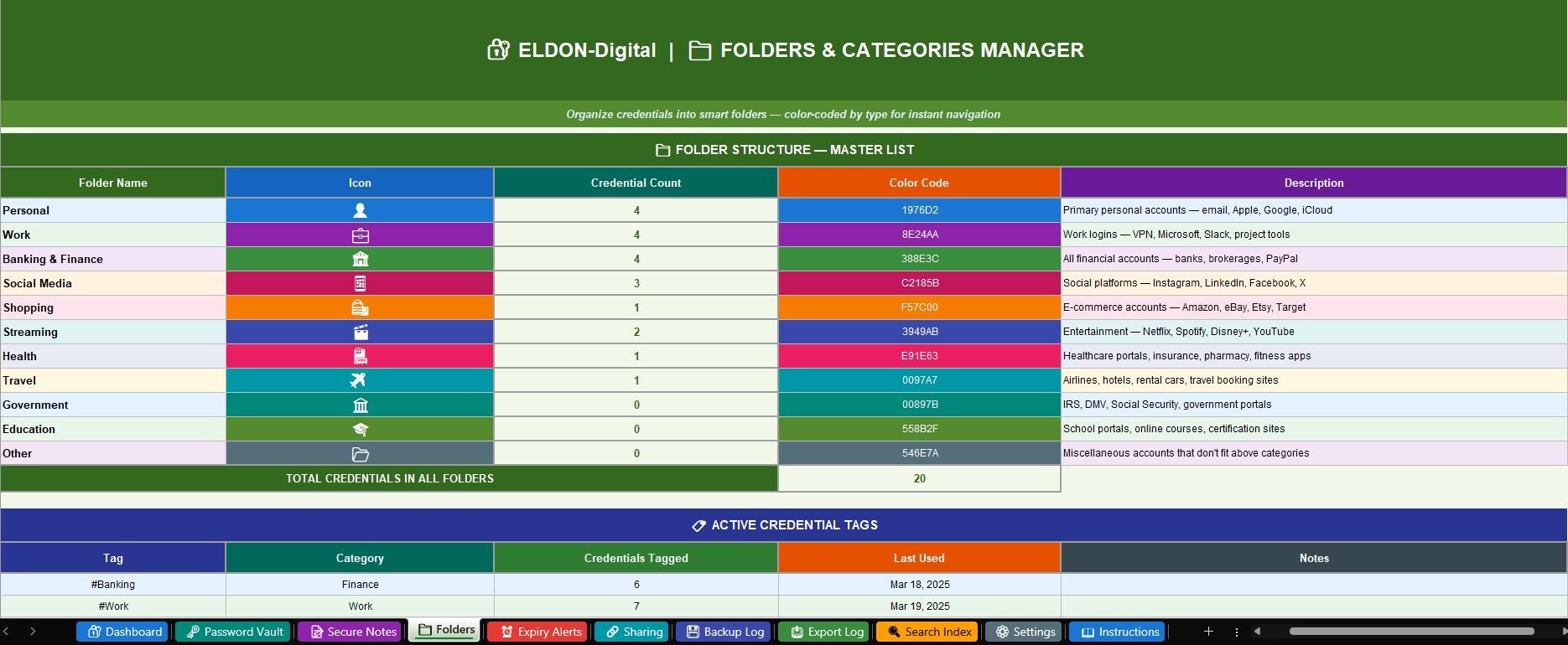 π‘οΈ You are not alone -and ELDON-Digital built the solution. The ELDON-Digital Password & Credential Manager is a professionally designed, beautifully color-coded spreadsheet system that brings order, security, and peace of mind to your entire digital life. No monthly subscription. No cloud you don't control. No app that could be hacked. Just your data, on your device, organized with military precision. π