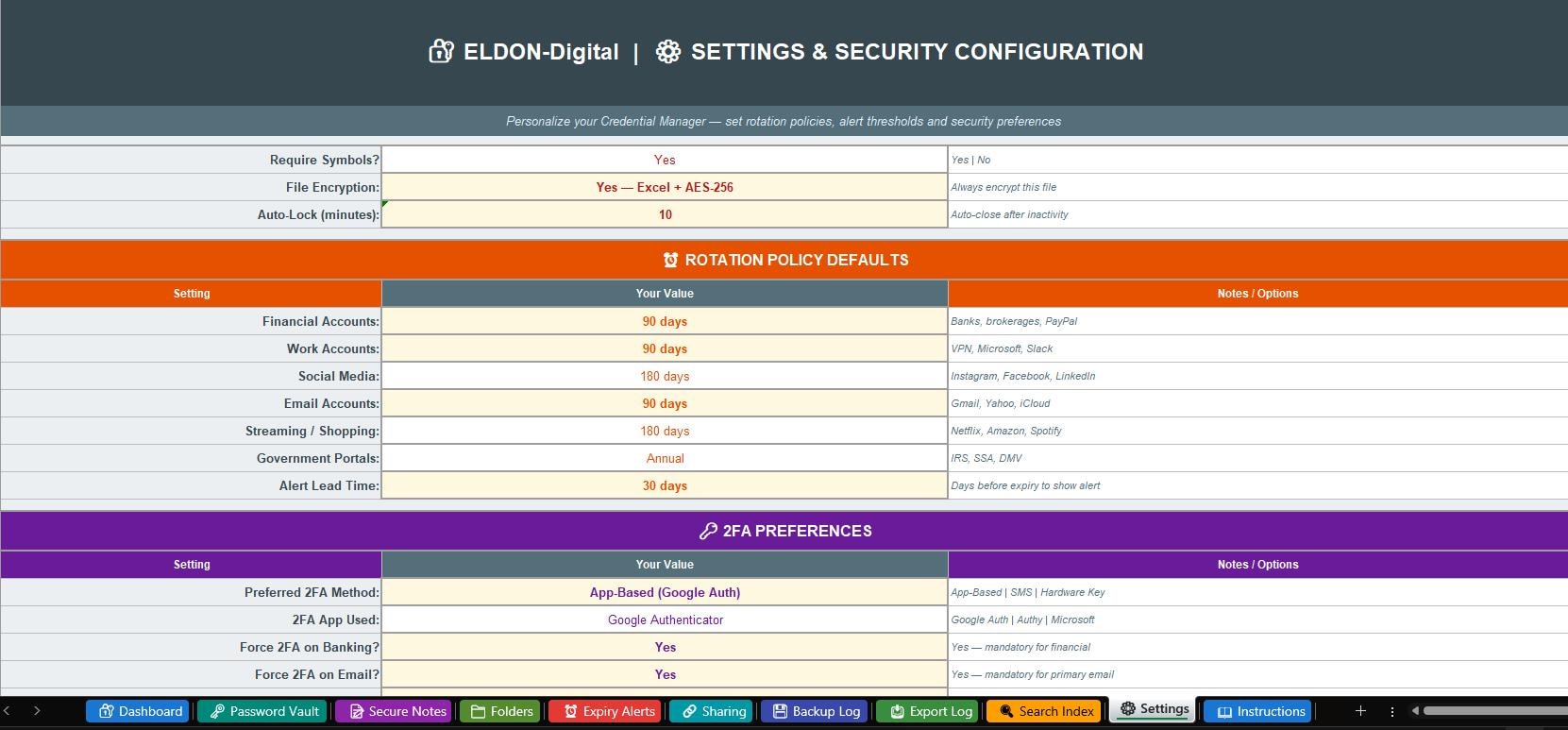βοΈ 10. Settings & Security Configuration -Six comprehensive configuration sections to personalize your entire system: Owner Profile (name, email, master hint -hint only!), Security Preferences (minimum length, complexity requirements, file encryption, auto-lock timer), Rotation Policy Defaults (set custom rotation schedules by account type), 2FA Preferences (preferred method, mandatory 2FA for banking/email, backup code storage), Backup Preferences (primary and secondary backup destinations, export format, paper backup), and Alert Preferences (alert lead days, breach check reminders, security score target). Yellow-highlighted cells mark critical security inputs π οΈ