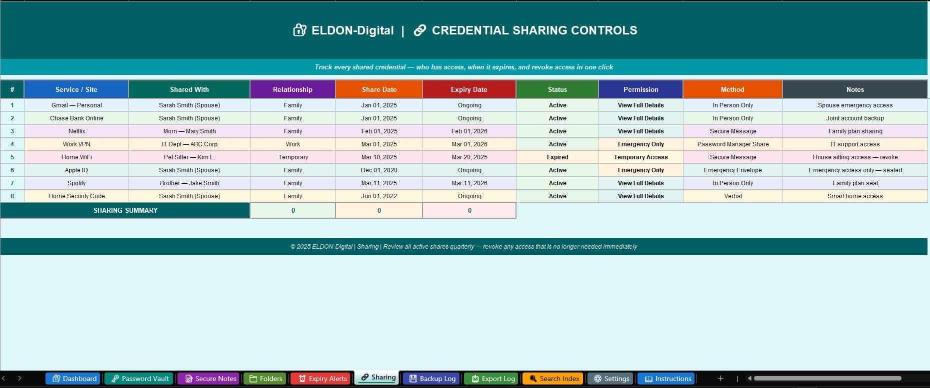 π 6. Credential Sharing Controls -Complete tracking of every credential you have shared with family, colleagues, or service providers. Record who you shared with, their relationship, share date, expiry date, current status (Active/Expired/Revoked/Pending), permission level (View Username Only/View Full Details/Emergency Only/Temporary Access), sharing method (In Person/Secure Message/Emergency Envelope), and notes. Color-coded status column makes it instant to see what is still active and what needs to be revoked. Summary row tracks active vs. expired vs. revoked shares π