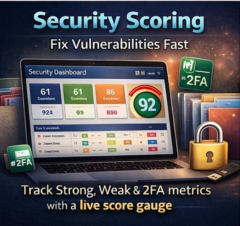 π 1. Security Dashboard -Your digital security command center! 12 live KPI cards automatically display Total Credentials, Strong Passwords count, Active Folders, Weak Passwords needing updates, Passwords Expiring Soon, Expired credentials, 2FA Enabled count, Secure Notes stored, Active Shares, Backup Records, an overall Security Score (out of 100), and Reused Password count. Features a Credentials by Category bar chart, a Password Strength pie chart (Strong/Moderate/Weak/Critical), a 10-row Recent Activity log, and a 5-row Security Alerts table with color-coded priority levels π