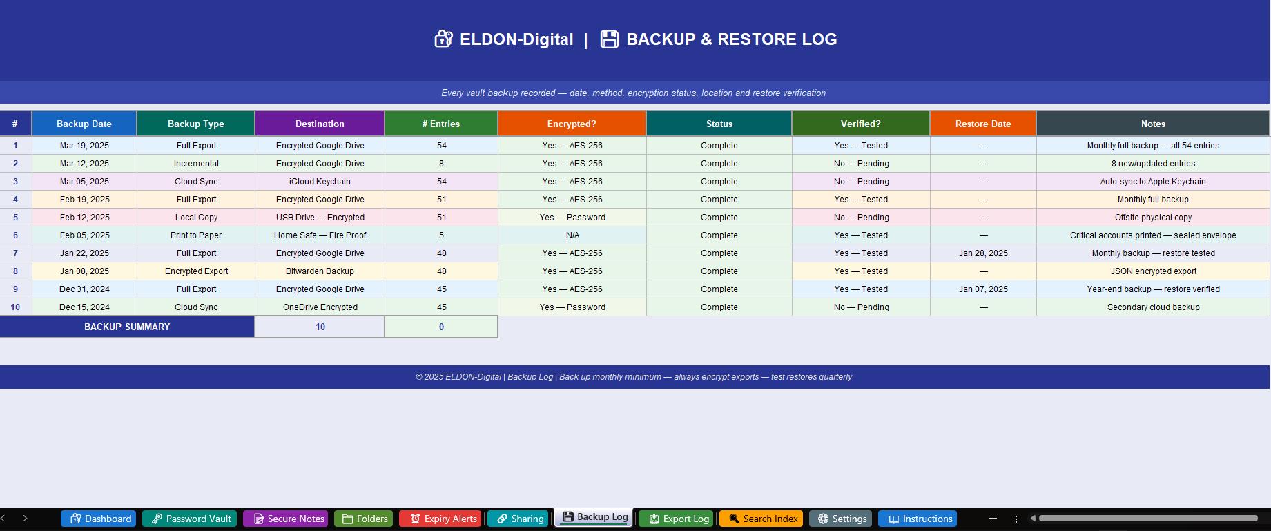 πΎ 7. Backup & Restore Log -Your complete vault backup audit trail. Record every backup with: date, backup type (Full Export/Incremental/Encrypted Export/Print to Paper/Cloud Sync), destination, number of entries backed up, encryption standard (AES-256/Password-Protected/None), completion status, verification status, restore test date, and notes. Tracks compliance with the 3-2-1 backup rule. Encryption and status columns color-code green for secure, red for unencrypted. Summary row shows total backups and completion rate ποΈ