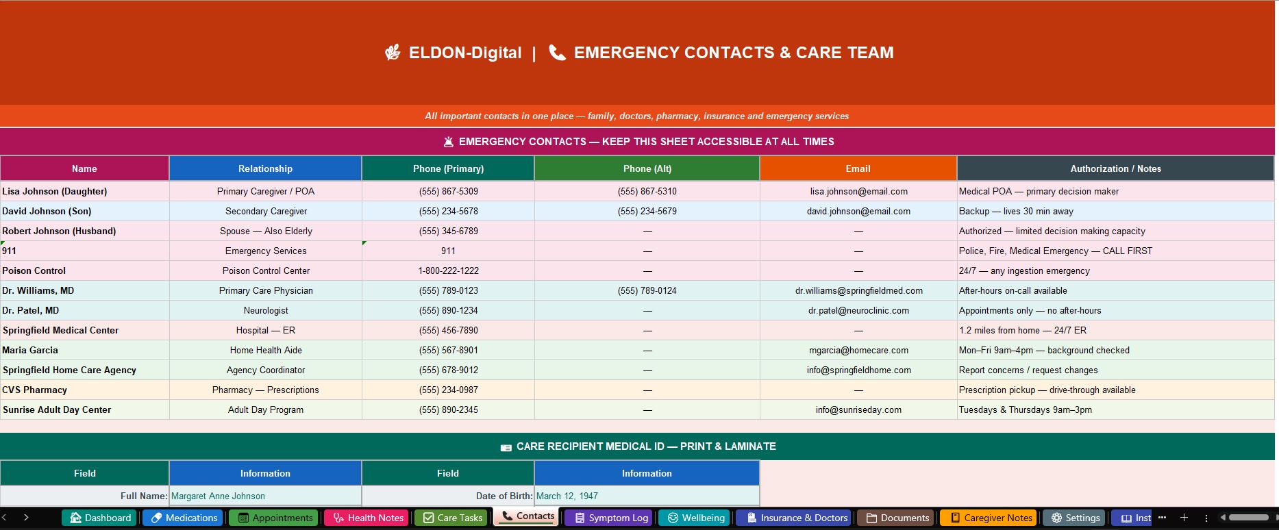 βββββ "The Emergency Contacts + Medical ID sheet alone is worth ten times the price. We laminated it and put it on the fridge, in the hospital bag, and in my wallet. The ER doctor said it was the most complete patient information he'd ever received from a family caregiver. Thank you ELDON-Digital."