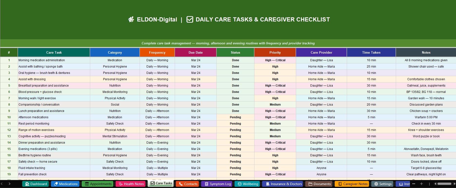 5. Daily Care Tasks & Caregiver Checklist - Your complete operational care guide. 25 pre-filled tasks cover morning, afternoon, and evening routines: medication administration, personal hygiene, nutrition, blood pressure monitoring, physical activity, cognitive stimulation, safety checks, administrative tasks, and social connection. Each has a category, frequency, priority (High - Critical/High/Medium/Low), assigned caregiver, time required, and status. Priority rows color-code red for critical, yellow for high, green for lower. Summary row tracks completion rate percentage automatically βοΈ