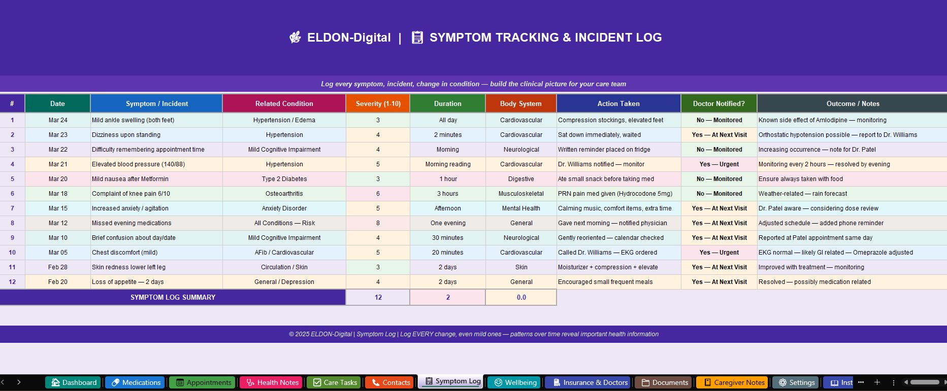 π 7. Symptom Tracking & Incident Log - Log every symptom, complaint, change, and incident - no matter how minor. Record date, symptom description, related condition, severity (1-10), duration, body system, action taken, whether the doctor was notified (Yes - Urgent/Yes - At Next Visit/No - Monitored), and outcome. Severity auto-colors green (1-3), yellow (4-5), orange (6-7), and red (8+). Summary row tracks total incidents, urgent notifications, and average severity score. This log builds the clinical picture that often reveals issues before they become crises π