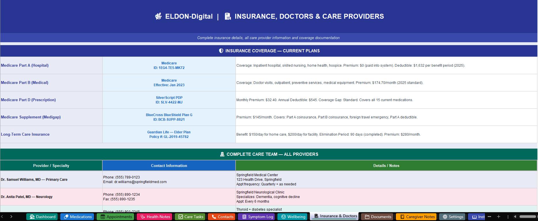 π₯ 9. Insurance & Complete Care Team Directory - Full insurance coverage details for all plans including Medicare Part A, Part B, Part D, Medigap Supplement, and Long-Term Care insurance - with policy numbers, premium amounts, coverage summaries, and deductibles. Plus a complete 9-provider Care Team directory with every doctor, therapist, dentist, optometrist, home health aide, and day program - including phone, fax, email, specialty, appointment frequency, and current treatment notes. Everything in one place for any substitute caregiver or hospital admission π‘οΈ
