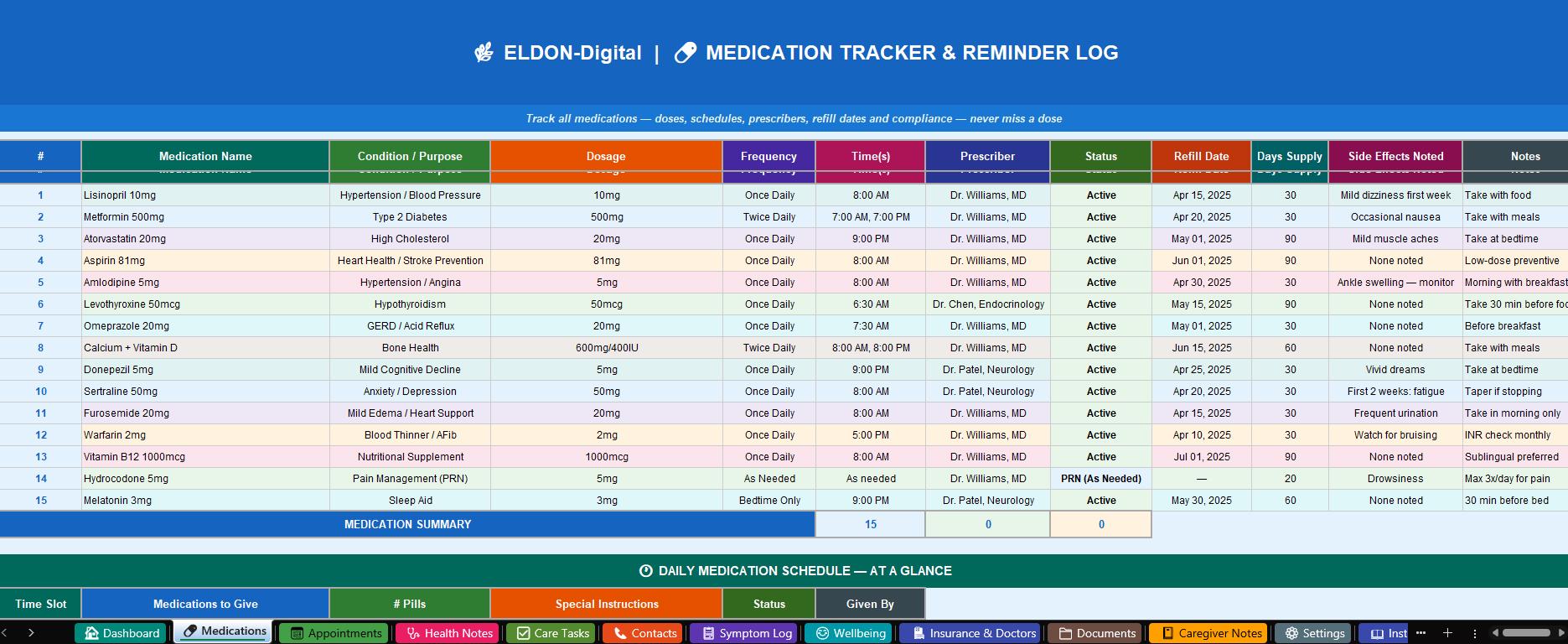Q: What if my loved one takes fewer medications? A: Simply fill in the rows that apply and leave others blank. All formulas and summary rows are designed to work accurately with any number of entries from 1 to 50+.