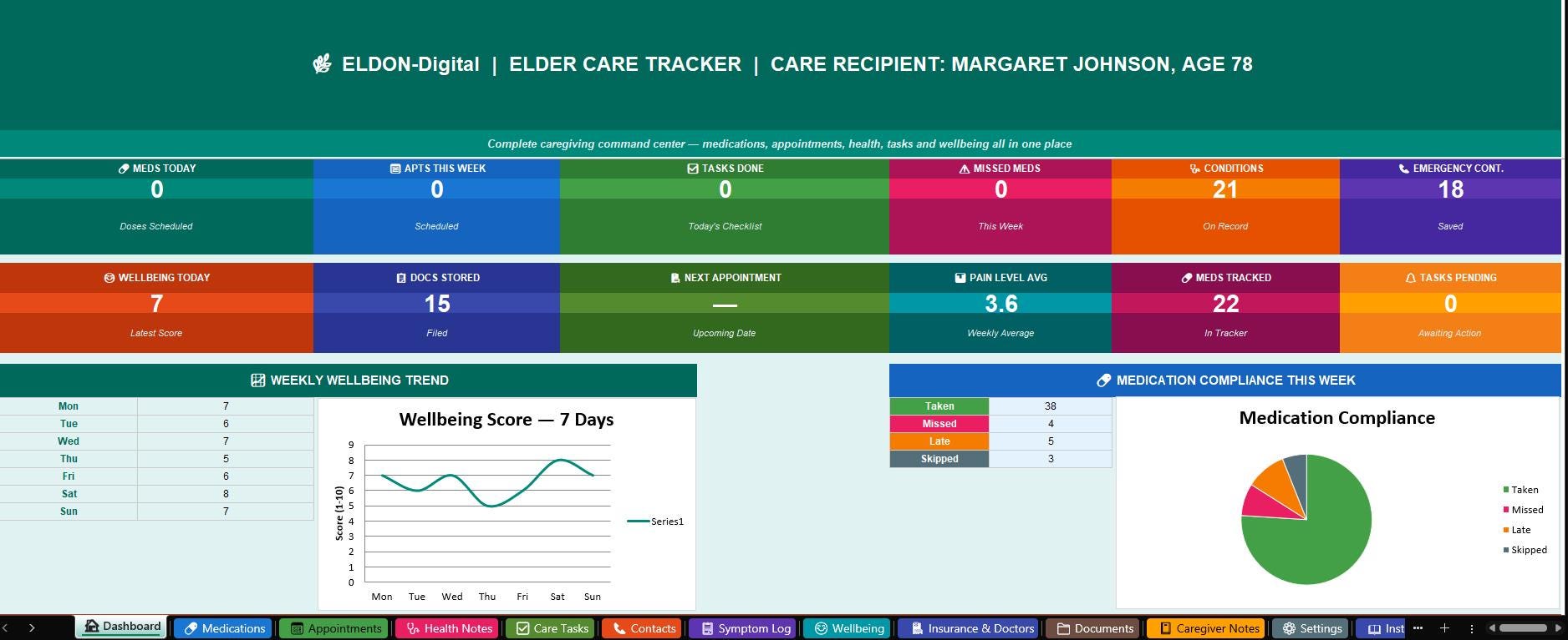 π 1. Daily Care Dashboard - Your caregiving command center! 12 live KPI cards automatically show: Medications Today, Appointments This Week, Care Tasks Completed, Missed Medications, Conditions on Record, Emergency Contacts saved, Today's Wellbeing Score, Documents Filed, Next Appointment Date, Average Pain Level, Medications Tracked, and Tasks Pending. Features a 7-day Wellbeing Trend line chart tracking quality-of-life scores across the week, and a Medication Compliance pie chart (Taken/Missed/Late/Skipped) showing compliance at a glance. A 10-row Today's Care Summary timeline maps every care event from morning through bedtime with color-coded completion status π