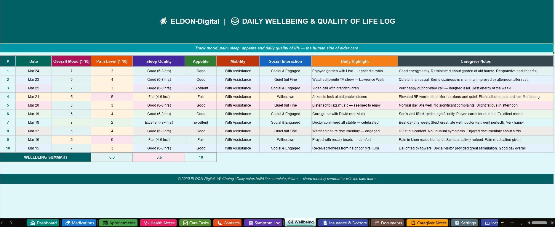 π 8. Daily Wellbeing & Quality of Life Log - The most human sheet in the tracker. Every day, log overall mood (1-10), pain level (1-10), sleep quality (Excellent/Good/Fair/Poor), appetite, mobility (Independent/Walker/Wheelchair), social interaction, a daily highlight, and caregiver notes. Mood and pain scores auto-color green for good, amber for fair, and red for concerning. Weekly averages calculate automatically. This log answers the question that really matters: not just "is she medically stable?" but "is she living a good life?" Monthly reviews of this data inform care planning conversations π