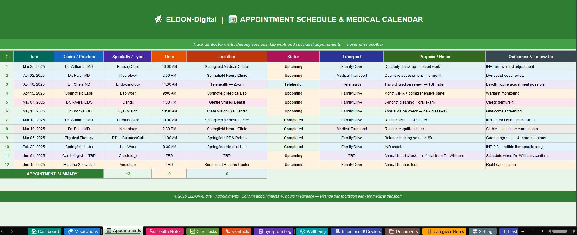 πΏ ELDON-Digital built this for you. The ELDON-Digital Elder Care Tracker is a beautifully designed, compassionately organized spreadsheet system that brings together every aspect of elder caregiving - medications, appointments, conditions, vital signs, daily tasks, symptoms, wellbeing, legal documents, and caregiver handoff notes - into one complete, professional, shareable system. Care smarter. Worry less. Never miss what matters. π