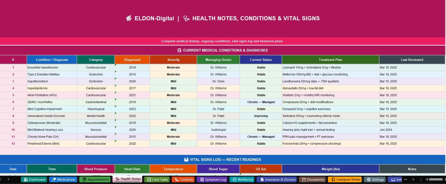 Q: Can I share this with my loved one's doctor? A: Yes - and doctors welcome organized families. Print the Medications sheet, Vital Signs log, Symptom Log, and Wellbeing trend before every appointment. The Health Notes conditions list and Care Team directory are especially useful at specialist referrals and hospital admissions.
