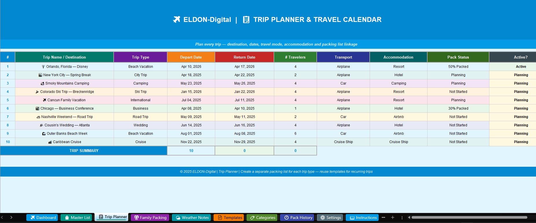 π 3. Trip Planner & Travel Calendar - Your multi- trip planning hub. Log up to 20 upcoming trips with: destination name and emoji, trip type (Beach/City/Business/Camping/Ski/Cruise/Wedding/Road Trip/International - 13 options), departure date, return date, number of travelers, transport method, accommodation type, packing progress status, and Active/Planning/Completed flag. The Active trip feeds the Dashboard countdown timer, current trip name, and destination KPI cards automatically. Summary row tracks total trips planned, active, and completed. Your complete travel calendar for the year in one organized view π
