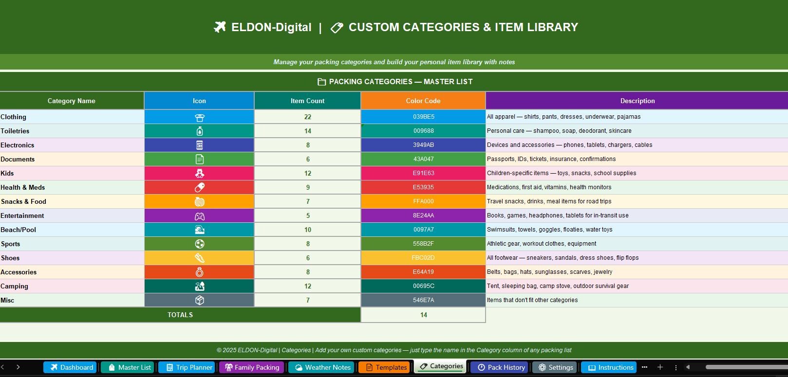 π·οΈ 7. Categories Manager - Your complete item taxonomy with 14 color- coded packing categories: Clothing, Toiletries, Electronics, Documents, Kids, Health & Meds, Snacks & Food, Entertainment, Beach/Pool, Sports, Shoes, Accessories, Camping, and Misc. Each category has its own icon, item count, color code swatch, and description. The categories feed all dropdown menus throughout the workbook. Add your own custom categories at the bottom of this list and they will appear in every dropdown automatically. Visual color swatches help you match items to their category at a glance π¨