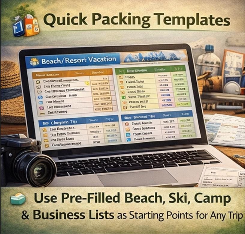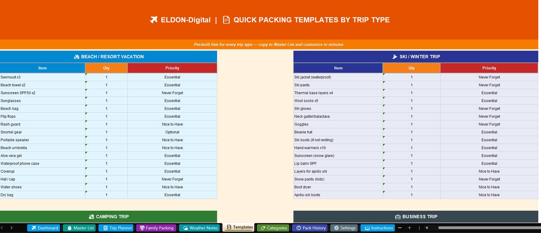 π 6. Quick Packing Templates - Four ready- to- copy packing templates organized side by side for instant list building: ποΈ Beach/Resort Vacation (16 items - swimsuit, sunscreen, rash guard, water shoes, beach umbrella, dry bag), πΏ Ski/Winter Trip (16 items - ski jacket, thermals, goggles, gloves, neck gaiter, hand warmers), ποΈ Camping Trip (16 items - tent, sleeping bag, headlamp, camp stove, bear canister, water filter), πΌ Business Trip (16 items - dress shirts, laptop, business cards, presentation USB, expense folder, blazer). Copy any template directly into your Master List or Family Packing sheet and customize. A complete new packing list in under 5 minutes for any trip type π