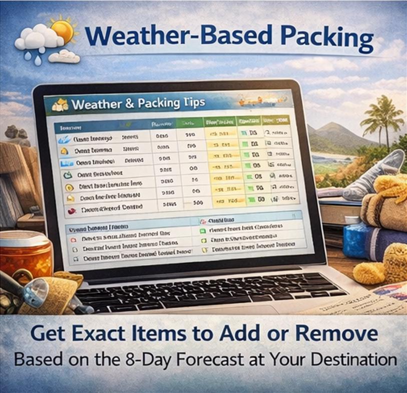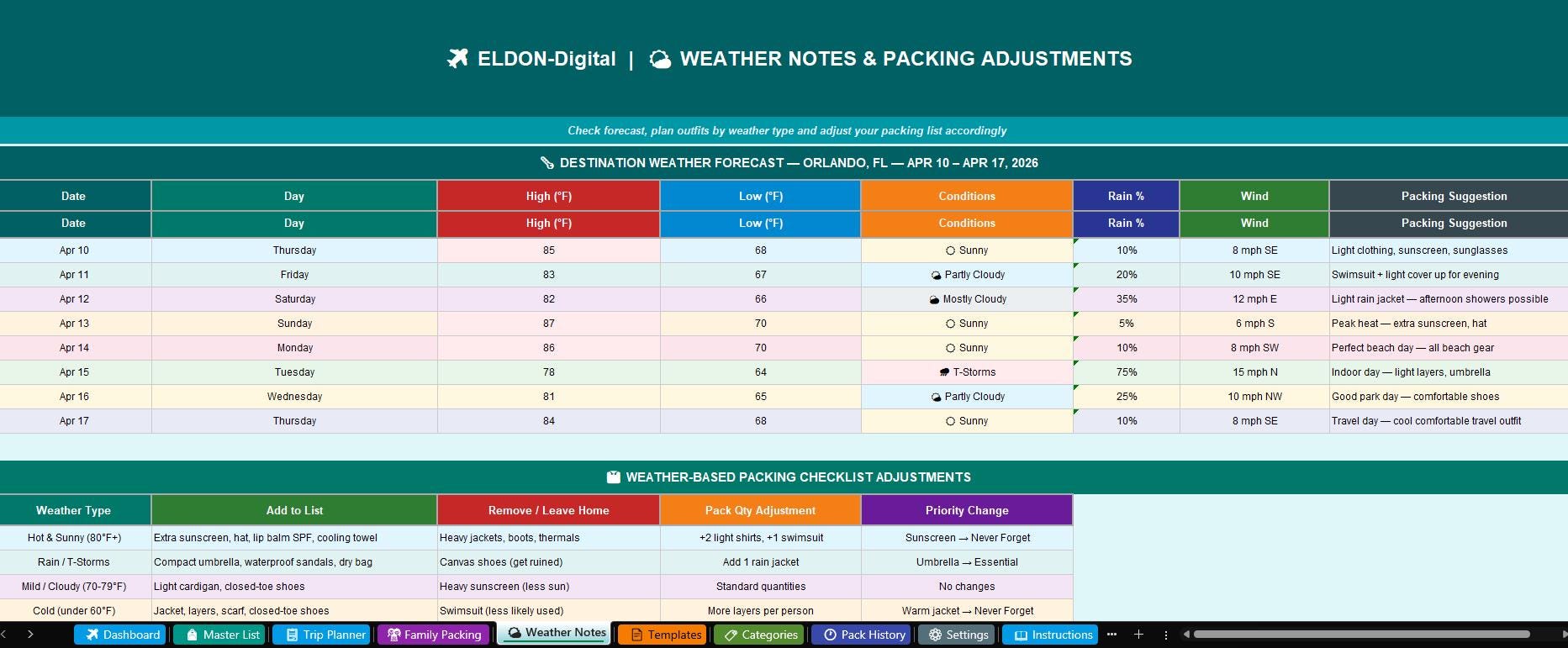 ), rain percentage, wind speed, and specific packing suggestions for each day. Days with 85Β°F+ temps auto- highlight red (add extra sunscreen). Rain days above 50% highlight in rose (pack umbrella). Below the forecast: an 8- scenario Weather- Based Packing Adjustment table covering Hot & Sunny, Rain/Storms, Mild/Cloudy, Cold Weather, High Humidity, Beach Destination, Theme Parks, and International Travel - each with exact items to add, items to remove, quantity adjustments, and priority changes π‘οΈ