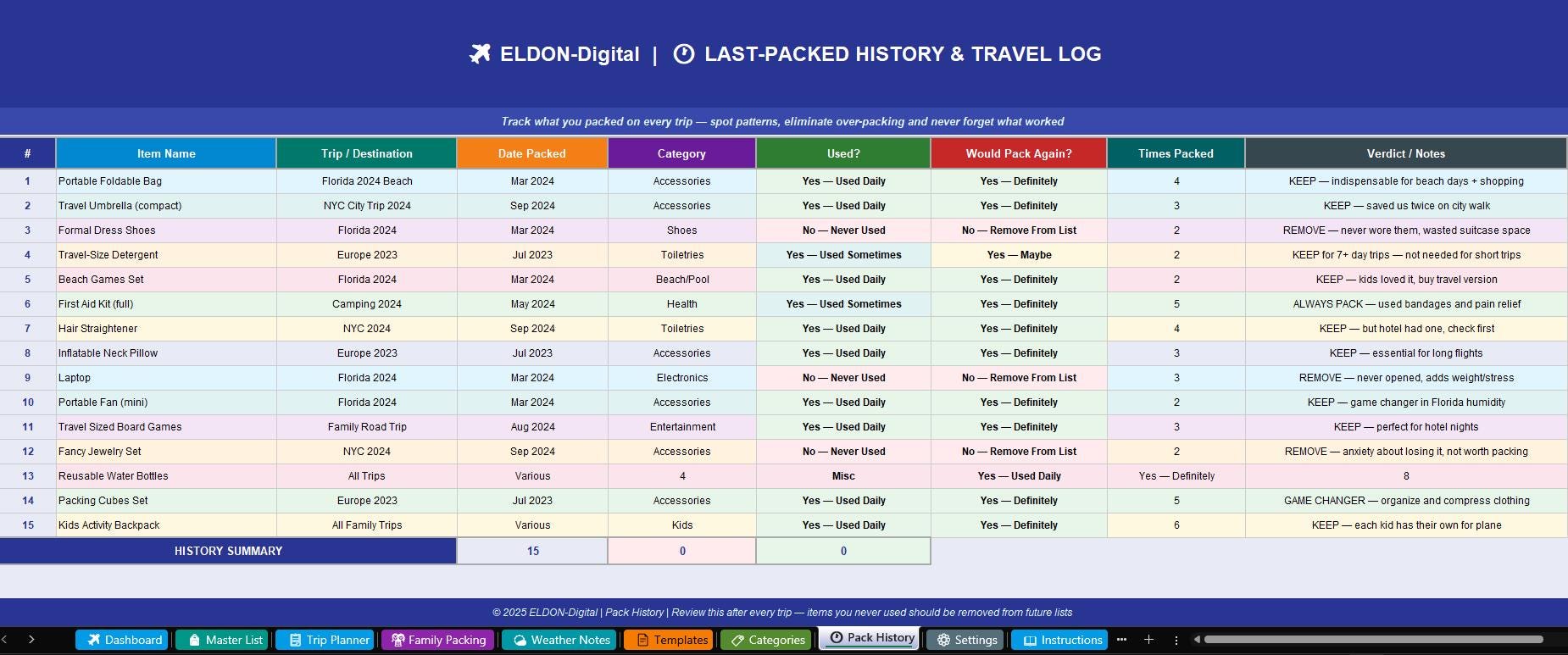 π 8. Last- Packed History & Travel Log - Your packing gets smarter with every trip. Log every item you have packed across past trips with: item name, destination, date packed, category, whether you used it (Yes - Used Daily / Used Sometimes / Never Used), whether you would pack it again (Yes - Definitely / No - Remove From List / Add More Quantity), total times packed across all trips, and a verdict note. 15 pre- filled history entries reveal real insights - formal dress shoes marked "REMOVE - never wore them," a portable fan marked "KEEP - game changer in Florida humidity," packing cubes marked "GAME CHANGER." Review this after every trip and your list gets lighter and more optimized each time π
