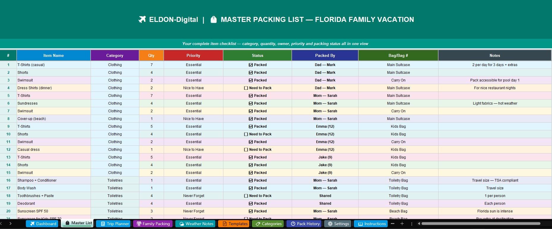 Pre- Filled with "The Johnson Family" Mock Data - See a complete 4- person Florida vacation packing system working immediately across all 10 sheets β