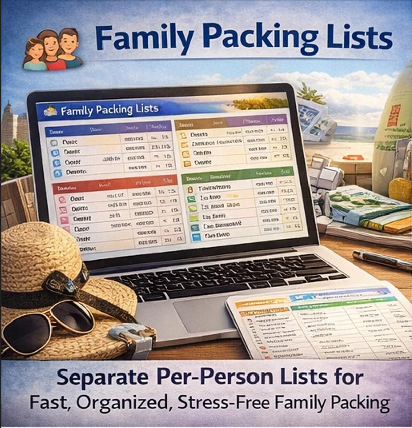 Q: Can I use this for just one person, not a whole family? A: Absolutely - the Master List works perfectly for solo travelers. Simply use one section of the Family Packing sheet or just the Master List on its own. All formulas adapt automatically to however many items you add.