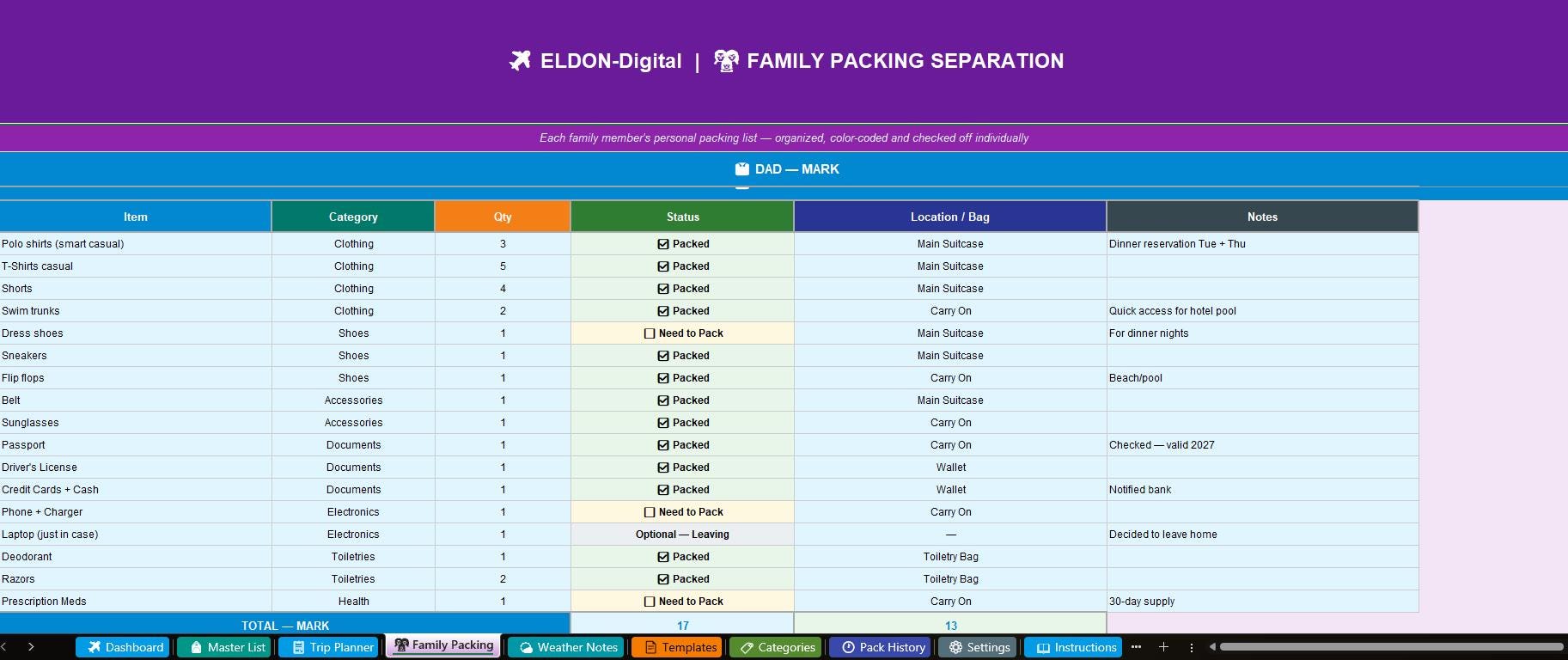 βοΈ ELDON- Digital ends all of that. The ELDON- Digital Packing List App is a beautifully designed, color- coded spreadsheet system that transforms chaotic trip packing into a fast, organized, stress- free process - for solo travelers, couples, and families of up to 8 people. Know exactly what is packed, what is missing, who is responsible for what, and how many days until your departure - all from one stunning dashboard. π§³
