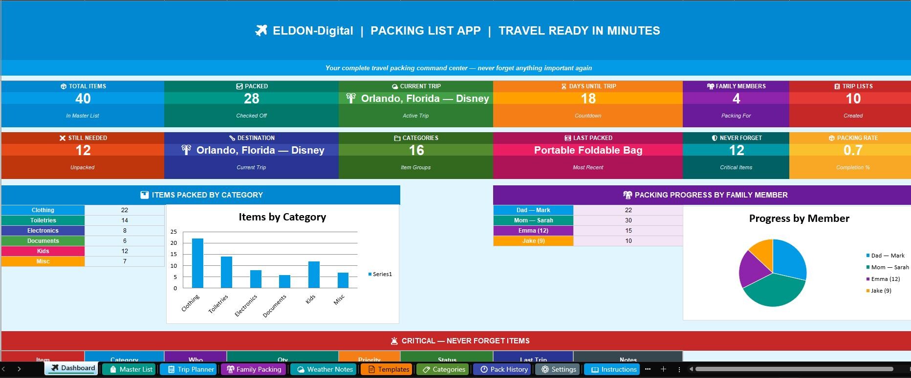 βοΈ 1. Travel Dashboard - Your packing command center! 12 live KPI cards automatically display: Total Items in List, Items Packed count, Current Active Trip name, Live Days Until Departure countdown, Family Members Packing, Total Trip Lists created, Items Still Needed, Destination name, Categories count, Last Packed item from history, Never Forget items count, and overall Packing Completion Percentage. Features an Items by Category bar chart showing your packing breakdown, and a Packing Progress by Family Member pie chart. A critical Never Forget section at the bottom highlights 8 must- not- forget items - passports, medications, chargers, insurance docs - with red/green packed status indicators. Every card updates automatically as you check items off π