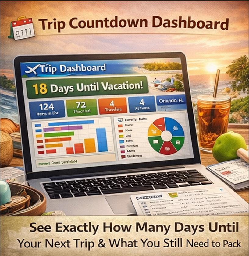 Q: Does the countdown timer work automatically? A: Yes - the Days Until Departure KPI on the Dashboard calculates automatically using TODAY() each time the file is opened. Simply enter your trip date in the Trip Planner and set the trip to "Active" - the countdown updates every day without any manual input.