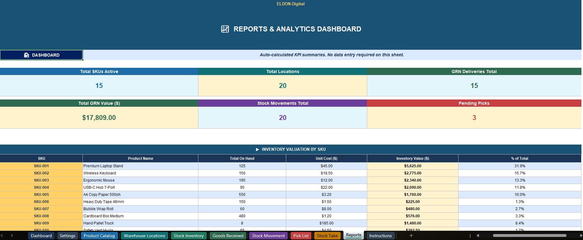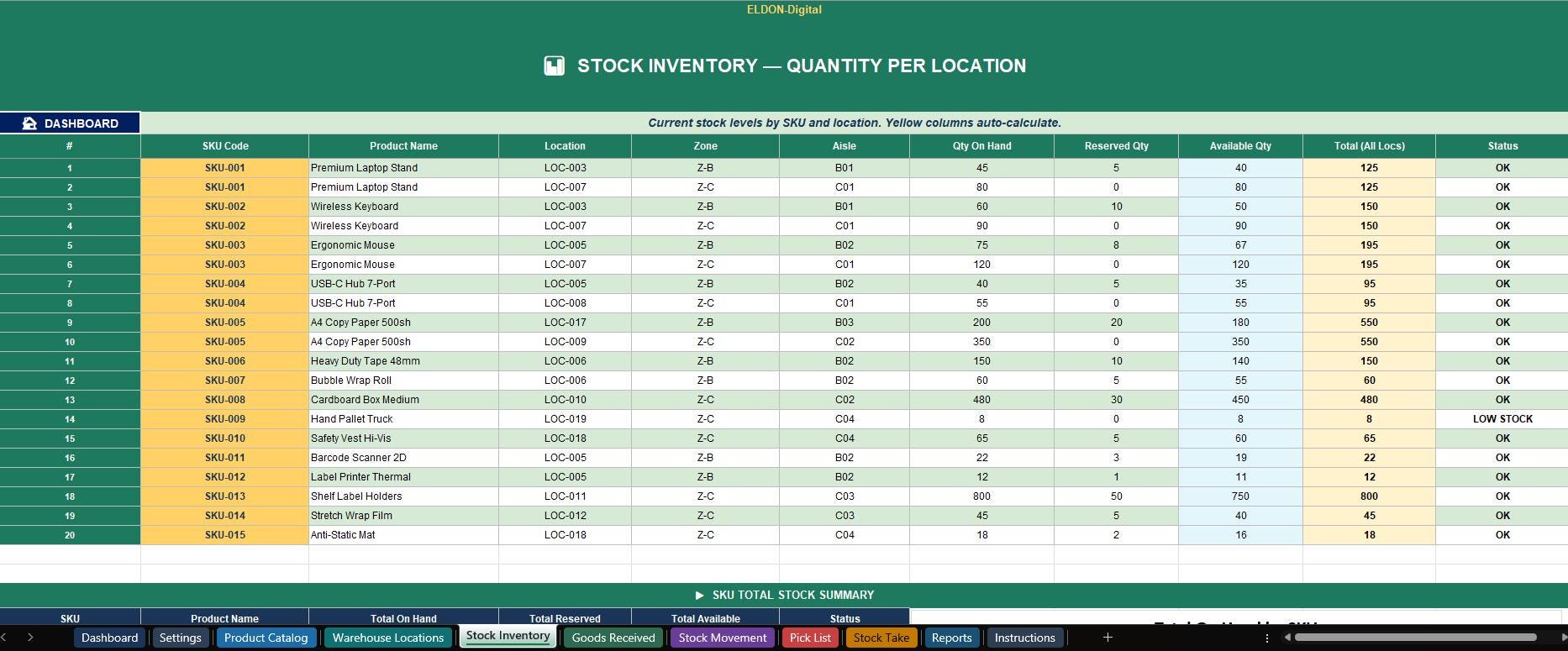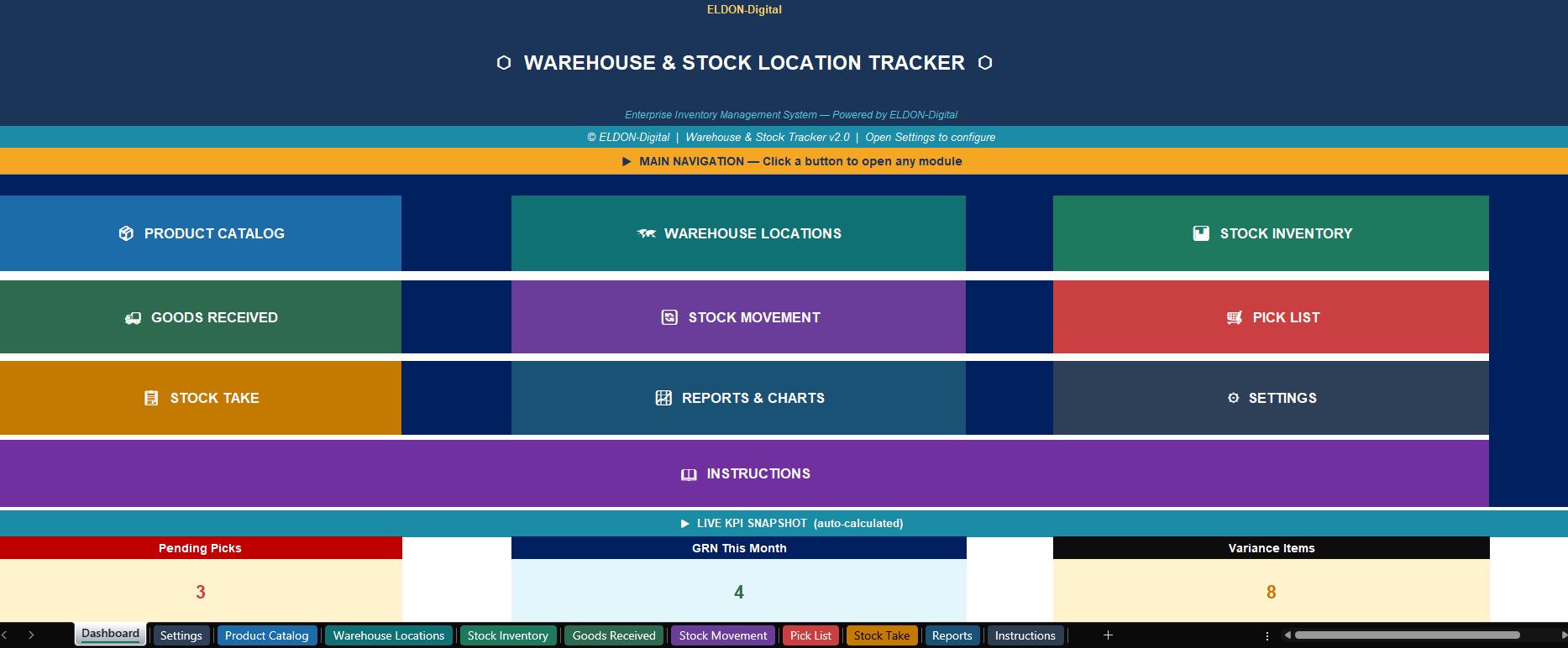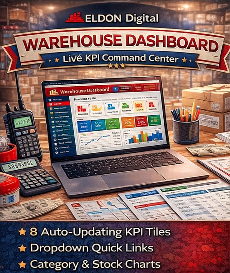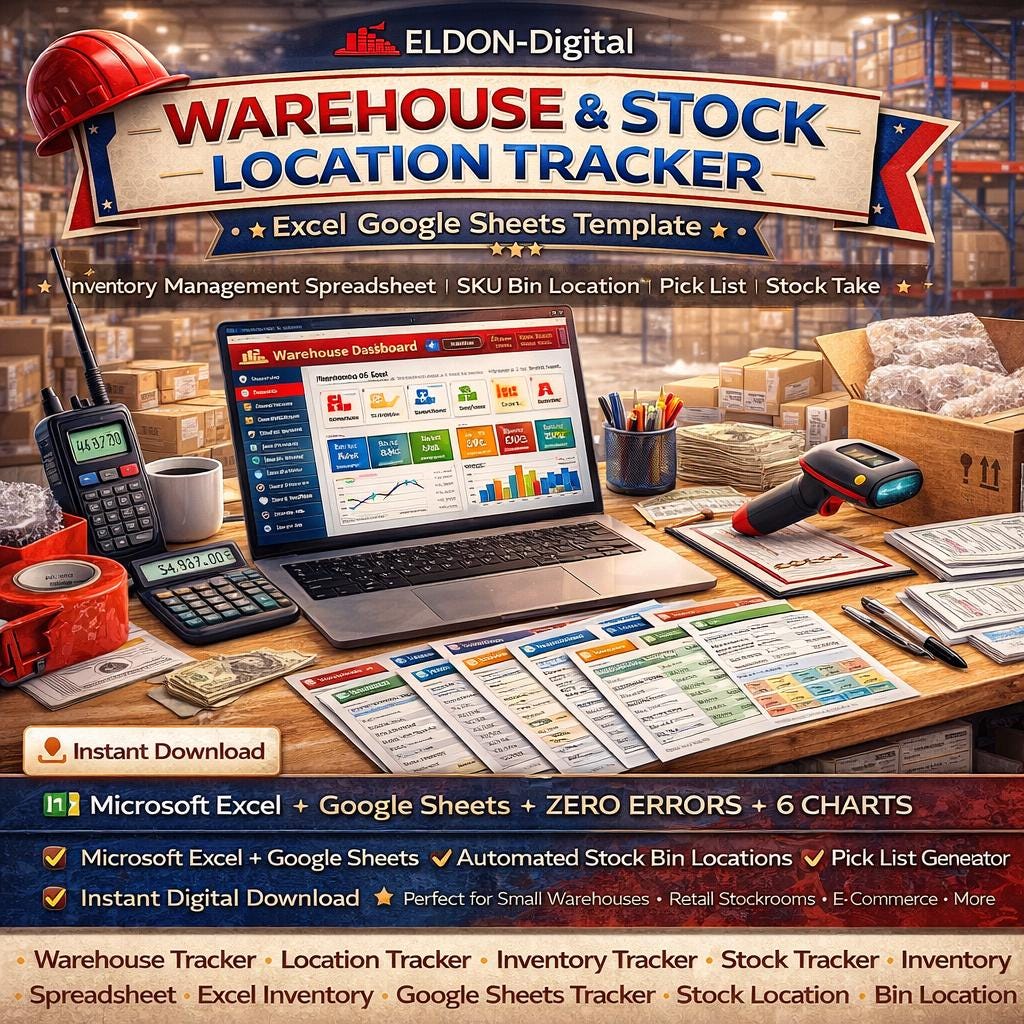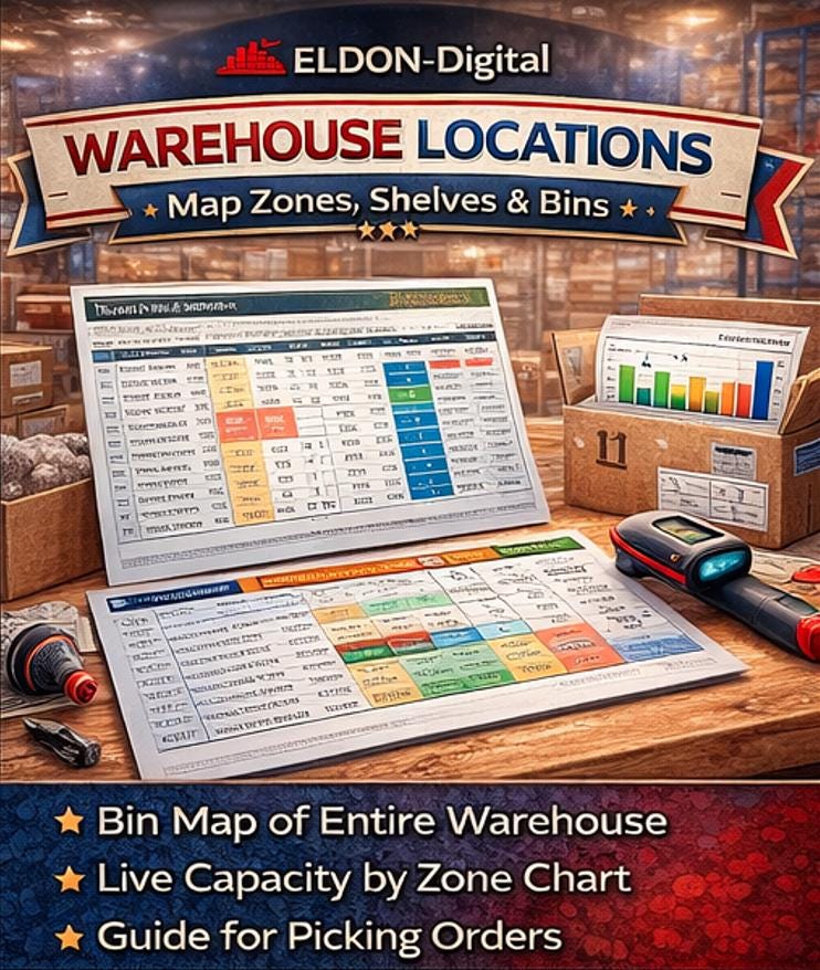 π Are you drowning in spreadsheets, sticky notes, and mystery stock levels? This professional-grade Warehouse & Stock Location Tracker by ELDON-Digital gives small businesses, warehouse managers, and logistics teams a fully automated, beautifully designed system -right inside Excel or Google Sheets. No software subscriptions. No coding. Just open, fill in your data, and run your warehouse like a pro. β