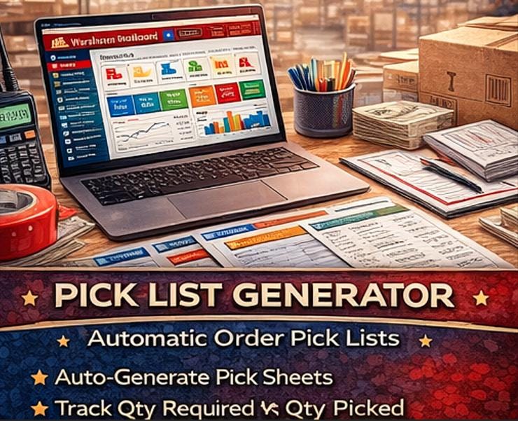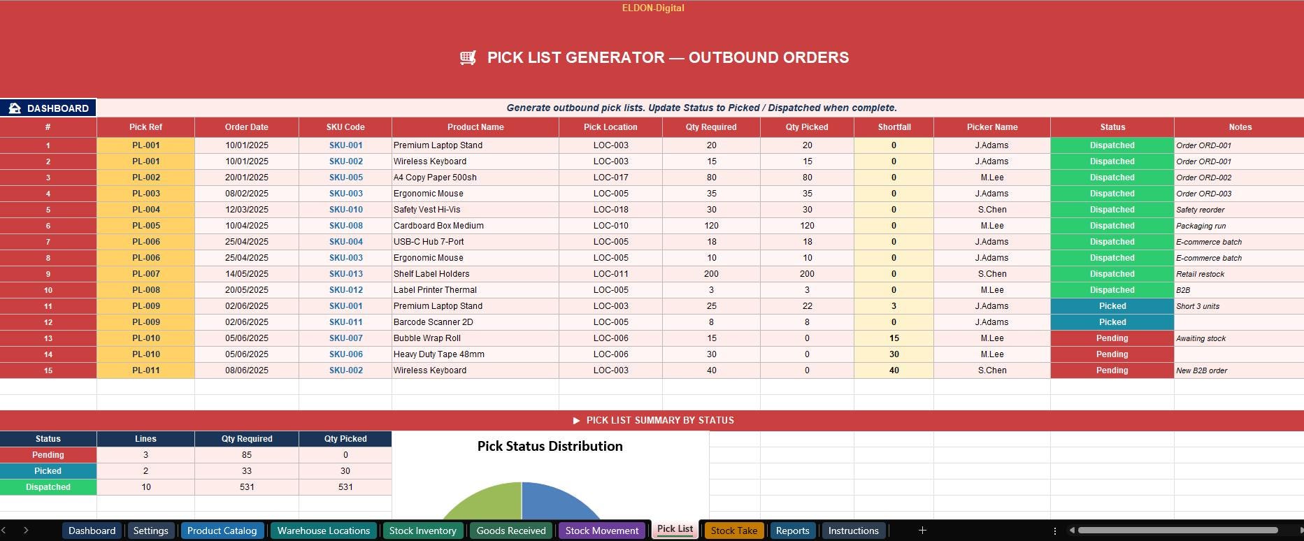π Pick List Generator -Build outbound pick lists by order. Track Qty Required vs Qty Picked, auto-calculate shortfalls, and manage status from Pending β Picked β Dispatched.