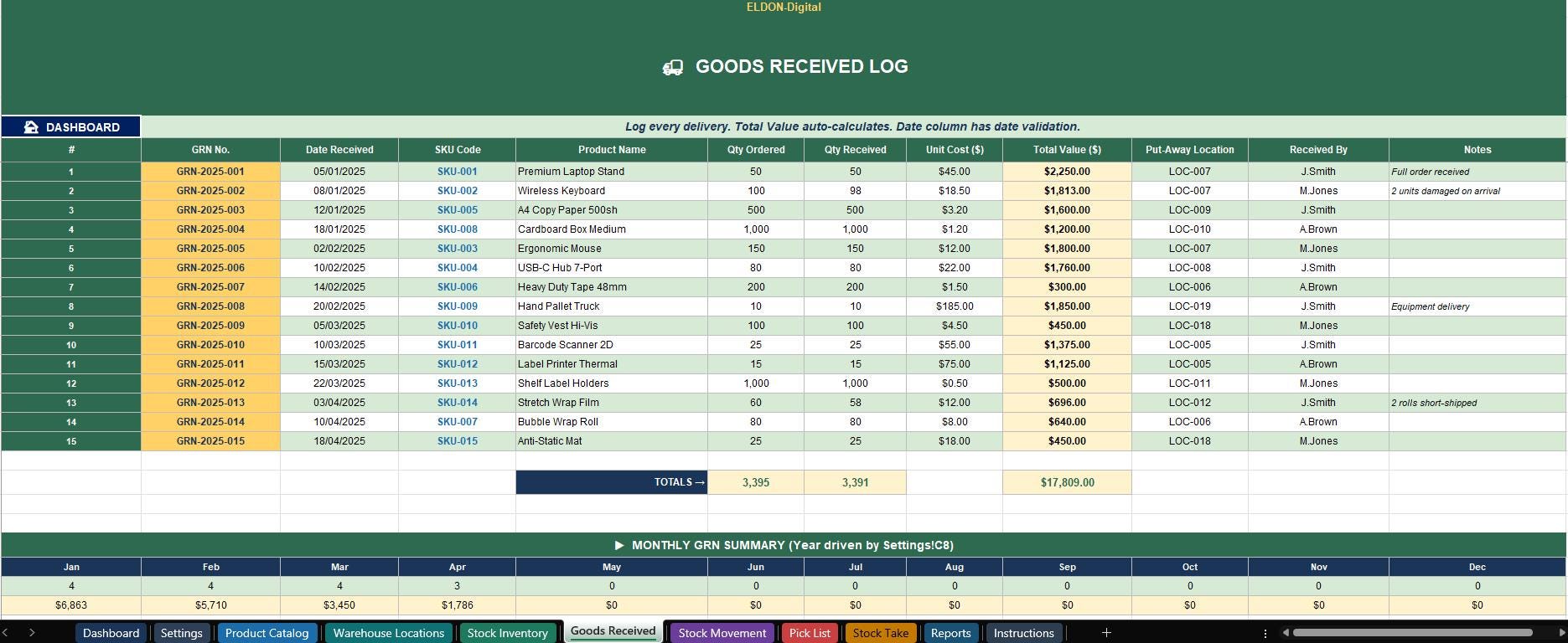 π Goods Received Log -Log every inbound delivery with GRN number, date, SKU, quantities ordered vs received, unit cost, and put-away location. Total Value auto-calculates. Monthly GRN trend chart included.