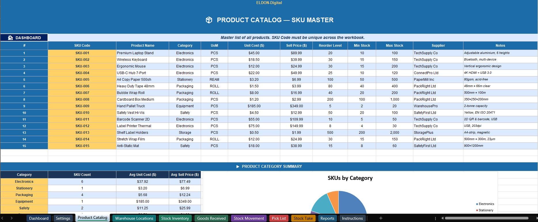 π¦ Product Catalog -SKU master list with Product Name, Category, Unit Cost, Selling Price, Reorder Level, Min/Max Stock, and Supplier. Includes a live pie chart breaking down your inventory by category.