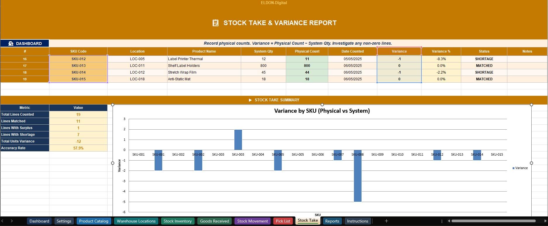 π Stock Take Sheet -Record your physical counts and instantly see Variance, Variance %, and MATCHED / SURPLUS / SHORTAGE status for every SKU. Accuracy rate auto-calculates.