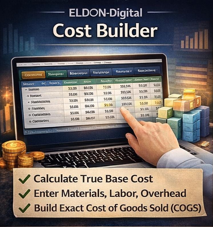 🧱 Cost Builder - Build your true product cost from scratch. Enter every raw material, labor time, packaging component, and overhead allocation. The sheet calculates your exact Cost of Goods Sold (COGS) automatically - down to the penny.