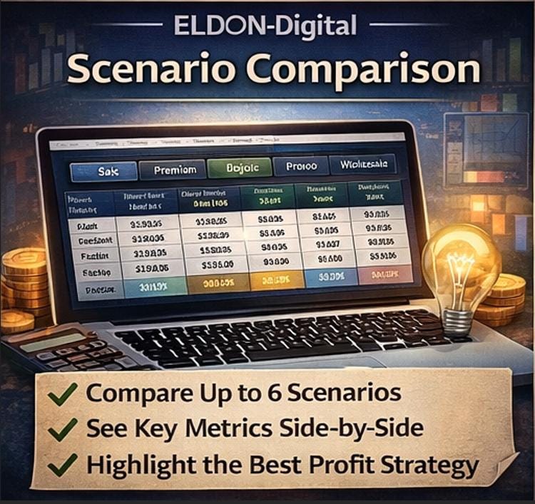 🔄 Scenario Comparison - Compare up to 6 pricing scenarios (Base, Premium, Budget, Promo, Wholesale, Bundle) side-by-side. The sheet automatically highlights your highest net profit scenario.