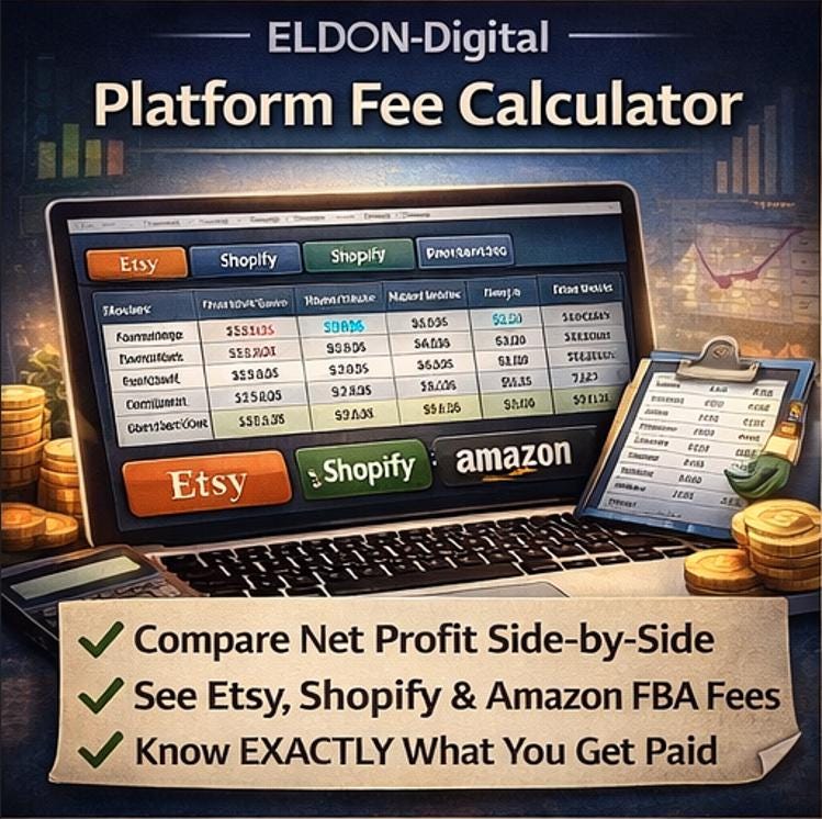 🏪 Platform Fee Calculator - Compare your real take-home profit across Etsy, Shopify, Amazon FBA, and Wholesale in one view. Every fee is broken down line by line - transaction fees, payment processing, listing fees, and ad fees - so you know exactly what each platform costs you per sale.