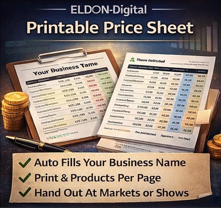 🖨️ Printable Price Sheet - A professionally formatted, print-ready price list with 8 product rows, your business name and tagline auto-filled from settings, retail and wholesale prices, margin %, and platform net profit columns. Print it and hand it to buyers at markets or wholesale meetings.