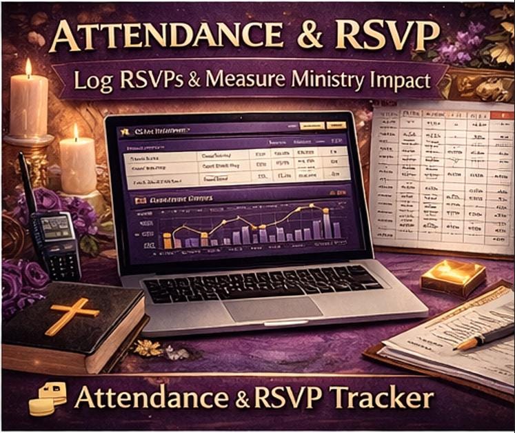 ✅ Attendance & RSVP Tracker - Log RSVPs before every event with attendee name, contact, number attending, meal preference, new visitor flag, and confirmation status. Check-in times are recorded for each attendee. New visitor counts update the Dashboard automatically - a key metric for measuring outreach effectiveness.