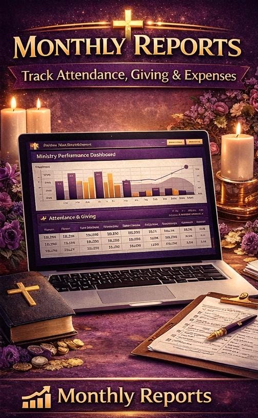 📈 Monthly Reports - A complete 12-month ministry performance dashboard showing events held, total attendance, new visitors, offerings, expenses, net balance, and volunteer hours for every month of your fiscal year. Two live charts - a revenue vs expenses bar chart and an attendance/giving trend line chart - update automatically. Year-to-date totals and 8 annual KPI metrics summarize your ministry's impact at a glance.