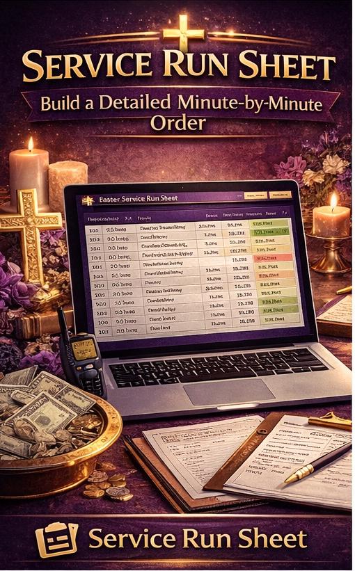 📋 Service Run Sheet - Build a minute-by-minute run sheet for any service or event. Each segment logs start time, duration, responsible person, AV requirements, microphone needs, script cues, and live status. Pre-loaded with a complete 18-segment Easter Sunday run order from volunteer setup at 7:30 AM through teardown at 11:30 AM. Duplicate and customize for any event.