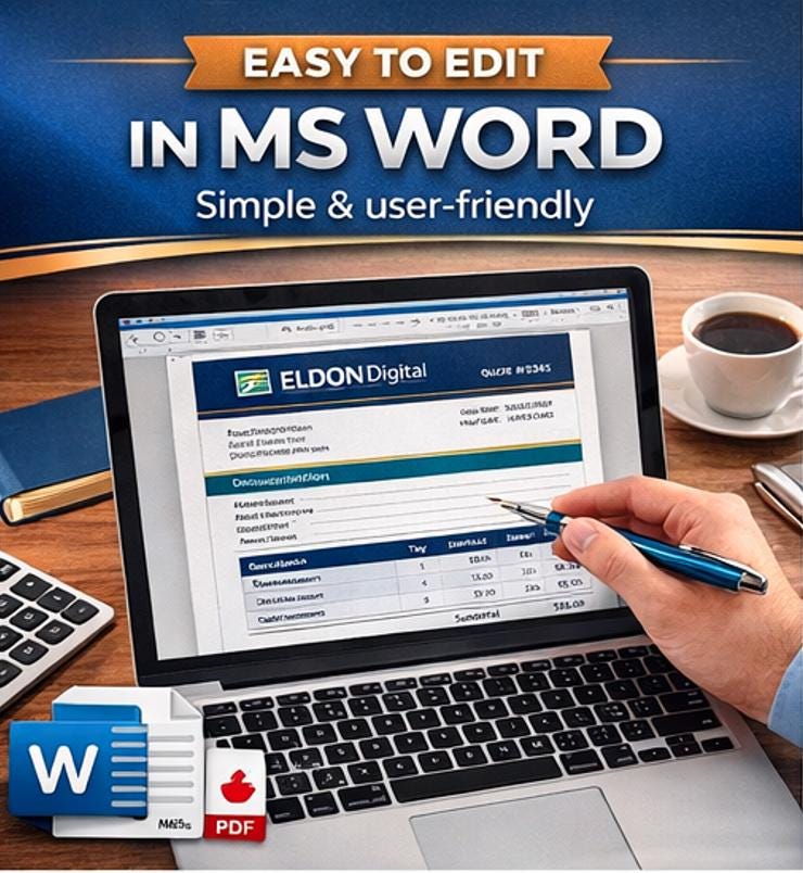 At ELDON Digital, we design templates that are not only practical, but also beautiful, structured, and ready for real business use. This quotation template is ideal for sellers, professionals, and service providers who want a quote document that looks modern, premium, and client-ready.