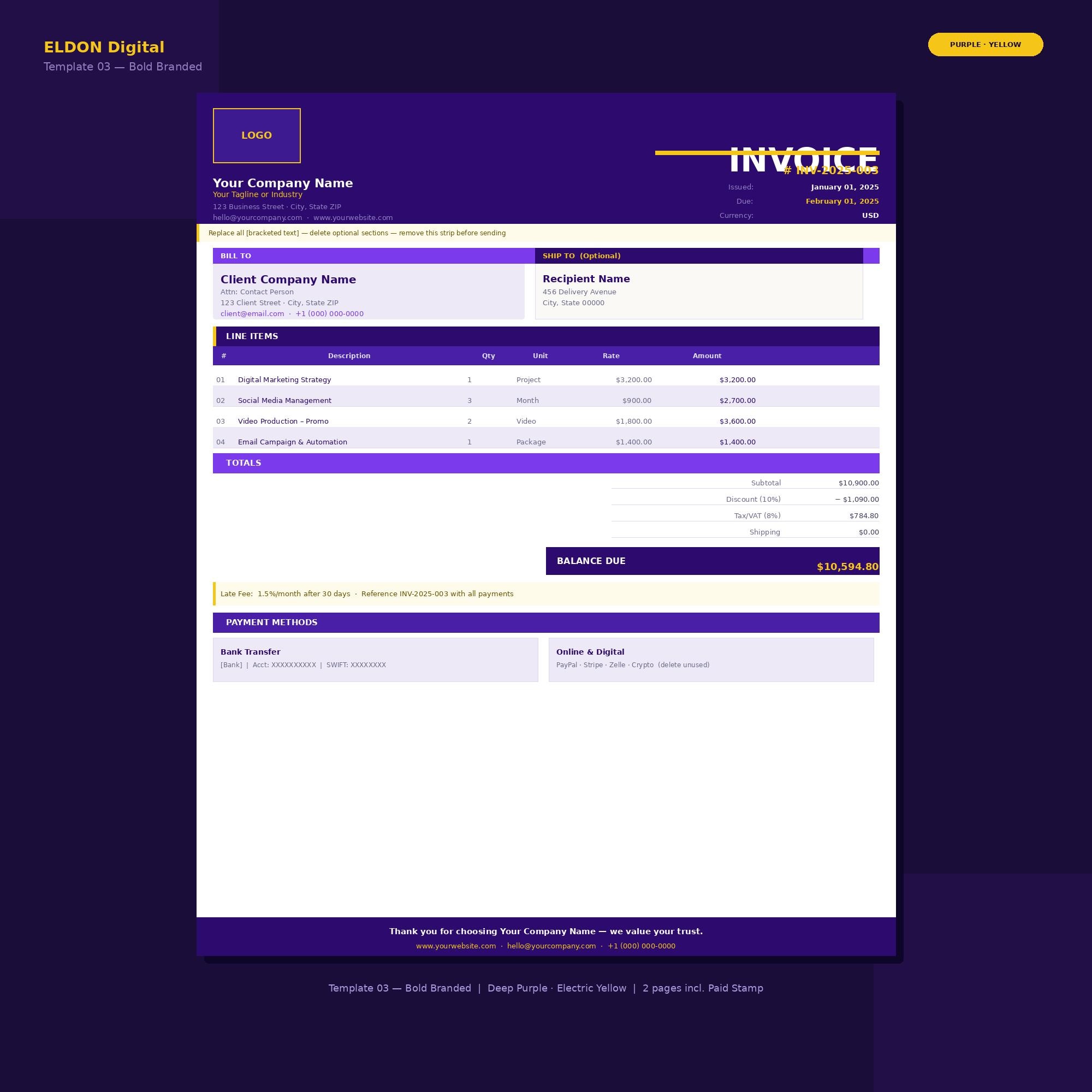 πΉ Template 03 - Bold Branded (Deep Purple + Electric Yellow) High-impact and unapologetically bold. A full-bleed purple hero with electric yellow accents - made for creative agencies, startups, and brands that want their invoice to feel as premium as their work. Heads turn before the amount is even read.