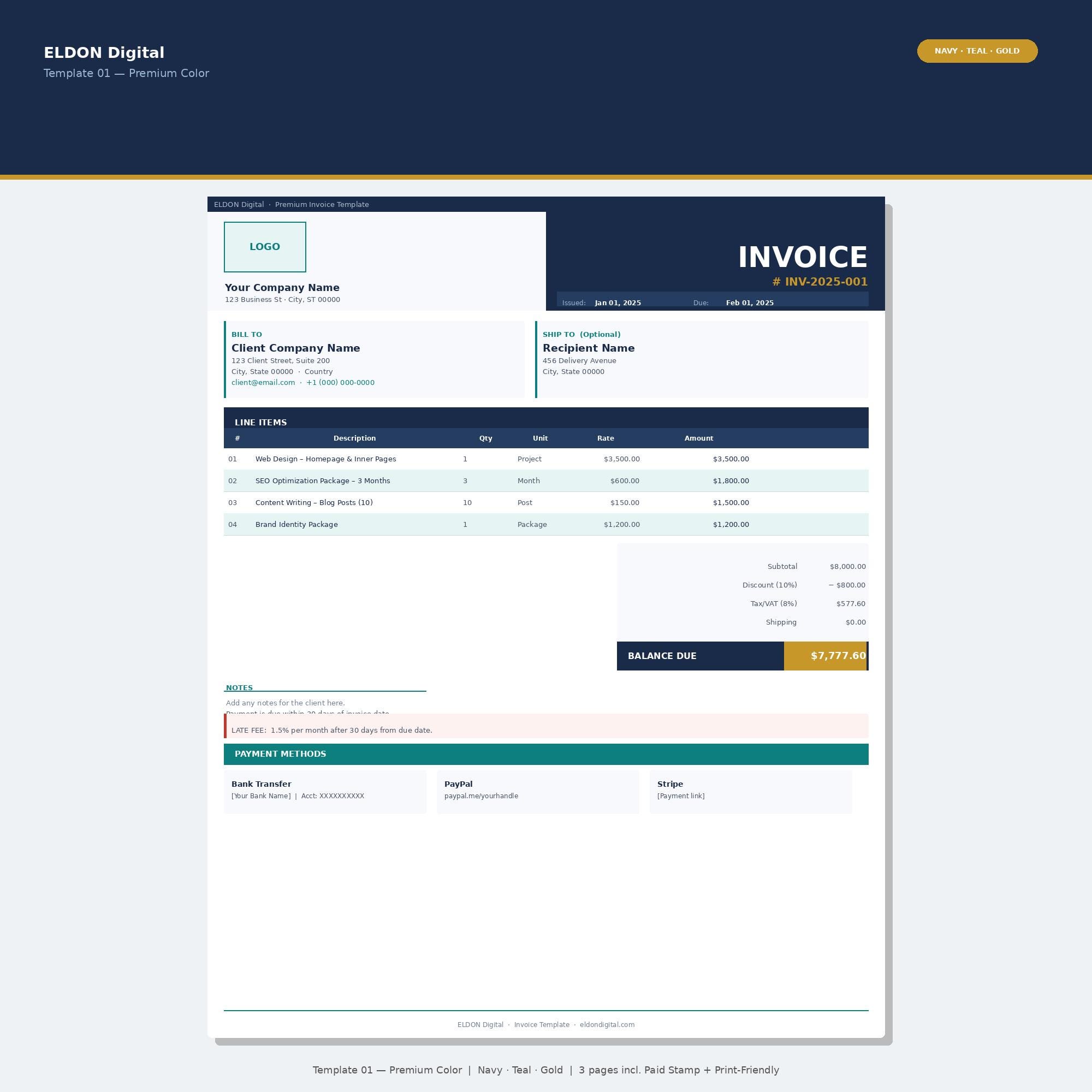 πΉ Template 01 - Premium Color (Navy + Teal + Gold) A sophisticated, colorful layout built for businesses that want a corporate-polished look. Features a full navy hero header, gold balance-due callout, teal accents, and 3 complete pages - main invoice, paid stamp version, and a clean printer-friendly page.