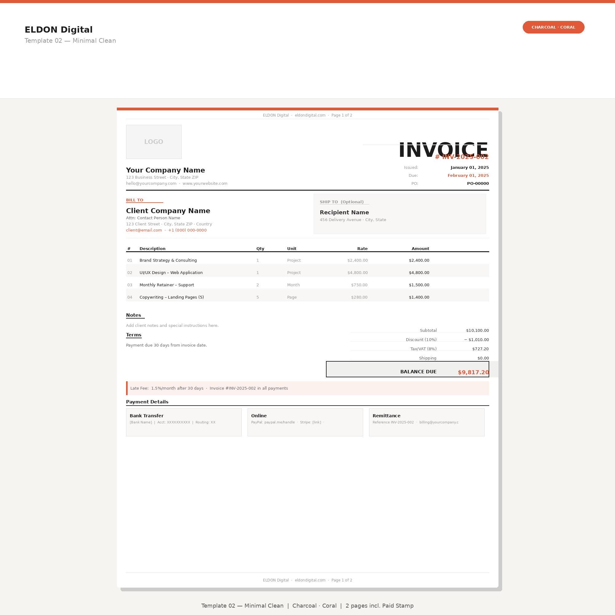 πΉ Template 02 - Minimal Clean (Charcoal + Coral) A calm, editorial-style design with generous white space and confident typography. Perfect for photographers, designers, coaches, and freelancers who want understated elegance. Coral accent on the due date and balance - clean, sharp, unmistakably professional.